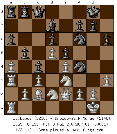 Last move : 1/2-1/2 2017 September 6 7:40:41 [Event "FICGS__CHESS__WCH_STAGE_2_GROUP_01__000017"] [Site "FICGS"] [Date "2017.07.19"] [Round "1"] [White "Fric,Lubos"] [Black "Drozdovas,Arturas"] [Result "1/2-1/2"] [WhiteElo "2218"] [BlackElo "2148"] 1.e4 e5 2.Nf3 Nc6 3.Bb5 Nf6 4.d3 Bc5 5.c3 O-O 6.O-O d6 7.Ba4 a6 8.Re1 b5 9.Bc2 Bb6 10.Nbd2 Ng4 11.Re2 Be6 12.Nb3 Nf6 13.a4 Re8 14.h3 Ne7 15.d4 Ng6 16.Be3 Qc8 17.Nbd2 c5 18.d5 Bd7 19.Re1 Qc7 20.Nf1 h6 21.N3d2 c4 22.Qf3 Bxe3 23.Nxe3 Reb8 24.Ra3 Qd8 25.Rea1 Qc8 26.Qe2 Nf4 1/2-1/2 Ruy Lopez : Berlin defense Kingside Castling by player Black (move 5) Kingside Castling by player White (move 6) This chess game ended in a draw. Follow this game move after move (download)Help your pieces so they can help you. (Paul Morphy) Kritik überlasse ich den Spießern. Ich zeige nichts, wofür ich mich schämen muss. (Alexandra Kosteniuk) Para mi, el Ajedrez es la vida y cada partida es como una nueva vida. Todo jugador de Ajedrez suele vivir muchas vidas durante su vida. (Eduard Gufeld) Les écrivains ont utilisé les échecs pour analyser les côtés extrêmes de la nature humaine. Dans ce cadre, les échecs offrent un champ d'expérimentation idéal. Mais on pourrait faire la même chose avec la peinture. Et là, en vous référant à Van Gogh, vous ne tirerez pas de conclusion définitive sur les peintres. (Gary Kasparov) Live, lose, and learn, by observing your opponent how to win. (Amber Steenbock)
