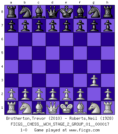 Last move : 1-0 2017 August 20 4:9:0 [Event "FICGS__CHESS__WCH_STAGE_2_GROUP_01__000017"] [Site "FICGS"] [Date "2017.07.19"] [Round "1"] [White "Brotherton,Trevor"] [Black "Roberts,Neil"] [Result "1-0"] [WhiteElo "2010"] [BlackElo "1928"] 1.g3 1-0 This chess game has been lost on time (started : 2017.07.19 22:7:23) Benko's Opening Player White won this chess game. Follow this game move after move (download)Examine moves that smite! A good eye for smites is far more important than a knowledge of strategical principles. (Purdy) Es tut gut, die Entwicklungsperiode von, [...] demokratischem Geist durchdringen zu lassen. Wie undemokratisch wäre es doch beispielsweise, den einen Offizier große Spaziertouren vornehmen zu lassen, während die anderen zu Hause säßen und sich entsetzlich langweilten. (Aaron Nimzowitsch) Aún el Rey más flojo huye despavorido ante la amenaza de un Jaque doble. (Aaron Nimzowitsch) On entre au jeu d'Echecs comme on entre en Religion. Pour le joueur d'Echecs, la partie d'Echecs c'est l'office, la messe, le défilé du 1er Mai, le dépôt de gerbe au Monument aux Morts. C'est un drame sacré. (Michel Roos) The problem with troubleshooting is that trouble shoots back. (Anonymous)