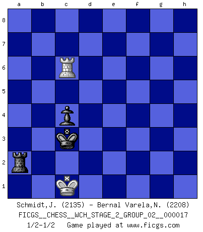 Last move : 1/2-1/2 2018 January 6 14:2:2 [Event "FICGS__CHESS__WCH_STAGE_2_GROUP_02__000017"] [Site "FICGS"] [Date "2017.07.19"] [Round "1"] [White "Schmidt,Jonny"] [Black "Bernal Varela,Nelson"] [Result "1/2-1/2"] [WhiteElo "2135"] [BlackElo "2208"] 1.e4 e6 2.d4 d5 3.exd5 exd5 4.Nf3 Bd6 5.c4 Nf6 6.Nc3 O-O 7.cxd5 Nbd7 8.Bg5 h6 9.Bh4 Nb6 10.Be2 Be7 11.O-O Nfxd5 12.Bxe7 Nxe7 13.Re1 c6 14.Qd2 Re8 15.h3 Be6 16.Bd3 Qc7 17.Rad1 Rad8 18.a3 Bb3 19.Rc1 Nc4 20.Qe2 Nd6 21.Qd2 a6 22.Bb1 Nd5 23.Nxd5 Bxd5 24.Ne5 Re6 25.Rc3 f6 26.Ng6 Rxe1+ 27.Qxe1 Re8 28.Qd2 Ne4 29.Bxe4 Bxe4 30.Nf4 Qd6 31.b4 Rd8 32.Ne2 Rd7 33.Re3 Bg6 34.Qc1 Bf7 35.h4 Qd5 36.Qc5 g6 37.f3 Qxc5 38.dxc5 Bc4 39.Nc3 f5 40.g3 Kf7 41.f4 a5 42.bxa5 Ba6 43.Na4 g5 44.fxg5 hxg5 45.Nb6 Rd1+ 46.Kf2 Rd2+ 47.Ke1 Rc2 48.Nd7 gxh4 49.gxh4 Ra2 50.Ne5+ Kg7 51.Rg3+ Kf6 52.Nf3 Re2+ 53.Kd1 Rf2 54.Nd2 Rh2 55.Nf3 Be2+ 56.Ke1 Bxf3 57.Rxf3 Rxh4 58.Rb3 Rh7 59.Rb6 Rc7 60.a6 bxa6 61.Rxa6 Ke5 62.Ra8 Kd4 63.Rd8+ Kc4 64.Rf8 Re7+ 65.Kd2 Re5 66.Rh8 Rd5+ 67.Kc2 Kd4 68.Rc8 Rxc5+ 69.Kd2 Kc4 70.Rh8 Re5 71.Rh7 Rd5+ 72.Kc2 Kd4 73.Rc7 Rc5+ 74.Kd2 Kc4 75.Rh7 Re5 76.Rh8 Re4 77.Rc8 Rd4+ 78.Kc2 Kd5 79.Kc3 Re4 80.Rd8+ Ke5 81.Ra8 f4 82.Ra5+ Ke6 83.Kd3 Re5 84.Ra8 Rf5 85.Ke2 Kd5 86.a4 Kc4 87.Rb8 Re5+ 88.Kd2 Rd5+ 89.Ke2 Rd3 90.Rf8 f3+ 91.Kf2 Ra3 92.Rf4+ Kb3 93.Rxf3+ Kxa4 94.Rf6 c5 95.Ke2 Kb3 96.Rc6 c4 97.Kd2 Ra2+ 98.Kc1 Kc3 1/2-1/2 French : Exchange variation Kingside Castling by player Black (move 6) Kingside Castling by player White (move 11) 10 pieces endgame at move 57 : White KRPPP , Black KRPPP WHITE : King + 1 Rook 3 Pawns BLACK : King + 1 Rook 3 Pawns 9 pieces endgame at move 60 : White KRPP , Black KRPPP WHITE : King + 1 Rook 2 Pawns BLACK : King + 1 Rook 3 Pawns 8 pieces endgame at move 61 : White KRPP , Black KRPP WHITE : King + 1 Rook 2 Pawns BLACK : King + 1 Rook 2 Pawns 7 pieces endgame at move 68 : White KRP , Black KRPP WHITE : King + 1 Rook 1 Pawn BLACK : King + 1 Rook 2 Pawns 6 pieces endgame at move 93 : White KRP , Black KRP WHITE : King + 1 Rook 1 Pawn BLACK : King + 1 Rook 1 Pawn 5 pieces endgame at move 93 : White KR , Black KRP WHITE : King + 1 Rook BLACK : King + 1 Rook 1 Pawn This chess game ended in a draw. Follow this game move after move (download)No one ever won a game by resigning. (Unknown) Garry Kasparov war erst in der Großmeister-Organisation GMA, dann in der Profischach-Vereinigung PCA, zum Schluss kehrte er wieder in den Schoß der FIDE zurück. Aber gut, manche Leute sind flexibel (Viswanathan Anand) De todos mis libros Rusos, la defensa contiene y difunde el 'calor' mas grande que pudiese verse extraño al observar lo supremamente abstracto que el Ajedrez supuestamente es. (Vladimir Nabokov) Soyez une menace à chaque fois que vous vous asseyez pour jouer. (Ken Smith) Wisdom doesn't necessarily come with age. Sometimes age just shows up all by itself. (Tom Watson)