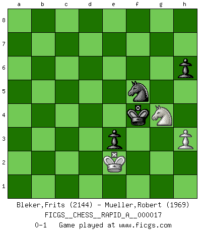 Last move : 0-1 2007 September 7 11:38:44 [Event "FICGS__CHESS__RAPID_A__000017"] [Site "FICGS"] [Date "2007.04.11"] [Round "1"] [White "Bleker,Frits"] [Black "Mueller,Robert"] [Result "0-1"] [WhiteElo "2144"] [BlackElo "1969"] 1.d4 Nf6 2.c4 e6 3.Nf3 Bb4+ 4.Nbd2 d5 5.e3 O-O 6.Bd3 dxc4 7.Bxc4 b6 8.O-O Bb7 9.a3 Be7 10.Qc2 Nbd7 11.b4 c6 12.Bb2 a5 13.b5 Rc8 14.bxc6 Bxc6 15.a4 Rc7 16.Rfc1 Qa8 17.Qd3 Rfc8 18.Ba6 Bb7 19.Bxb7 Qxb7 20.Rxc7 Rxc7 21.e4 Bb4 22.Rb1 h6 23.h3 Ne8 24.e5 Nf8 25.Nf1 Ng6 26.Ne3 Rc8 27.Kh2 Nc7 28.Rc1 Ne7 29.Nd2 Ncd5 30.Rxc8+ Qxc8 31.Ndc4 Qc6 32.Qc2 b5 33.axb5 Qxb5 34.Nd6 Qd7 35.Ndc4 a4 36.Ba3 Qa7 37.Qb2 Bxa3 38.Qxa3 Nc6 39.Qd6 Ncb4 40.Nxd5 Nxd5 41.Qa3 Qxd4 42.Qxa4 Qxf2 43.Nd6 g5 44.Qe4 Kg7 45.Ne8+ Kf8 46.Nd6 Ne3 47.Qa8+ Kg7 48.Ne8+ Kg6 49.Qe4+ Nf5 50.Kh1 Qf1+ 51.Kh2 Qf4+ 52.Qxf4 gxf4 53.Kg1 Ng7 54.Nd6 f6 55.exf6 Kxf6 56.g4 fxg3 57.Ne4+ Ke5 58.Nxg3 Nf5 59.Nh5 Kd4 60.Nf4 e5 61.Ng6 e4 62.Kf2 e3+ 63.Kf3 Kd3 64.Ne5+ Kc3 65.Ke2 Kd4 66.Ng4 Ke4 67.Nf6+ Ke5 68.Ng4+ Kf4 0-1 Bogo-Indian defense, Gruenfeld variation Kingside Castling by player Black (move 5) Kingside Castling by player White (move 8) 10 pieces endgame at move 55 : White KNPPP , Black KNPPP WHITE : King + 1 Knight 3 Pawns BLACK : King + 1 Knight 3 Pawns 9 pieces endgame at move 55 : White KNPP , Black KNPPP WHITE : King + 1 Knight 2 Pawns BLACK : King + 1 Knight 3 Pawns 8 pieces endgame at move 56 : White KNP , Black KNPPP WHITE : King + 1 Knight 1 Pawn BLACK : King + 1 Knight 3 Pawns 7 pieces endgame at move 58 : White KNP , Black KNPP WHITE : King + 1 Knight 1 Pawn BLACK : King + 1 Knight 2 Pawns Player Black won this chess game. Follow this game move after move (download)Kasparov : J'adoube , Ivanchuk : S'il vous plaît ! (Garry Kasparov & Vassily Ivanchuk, Linares 1997) Die meiste Zeit treffe ich auf Gegner, die meine Enkel sein könnten. Ich bin da, um ihnen zu zeigen, dass sie von mir noch einiges lernen können. (Viktor Kortschnoi) El Ajedrez es una hermosa aventura. (Bent Larsen) Les échecs c'est le défi de l'alpiniste, toujours plus haut, prêt à tout pour monter à l'assaut du Roi ennemi. Les échecs, c'est de la musique en mouvement, un ballet majestueux pour les yeux. C'est de la poésie composée par les fantômes du passé qui au même titre que Rimbaud ou Verlaine méritent notre admiration. Les échecs, c'est de la peinture ou le moindre mouvement modifie le tableau pour en faire un Picasso ou un Van Gogh. Les échecs, c'est tout et rien, c'est la vie et la mort. Jjulie33 sur le forum de France-Echecs. Internal peace cannot coexist with external war. (Don Groves)