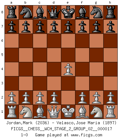 Last move : 1-0 2017 August 19 16:7:21 [Event "FICGS__CHESS__WCH_STAGE_2_GROUP_02__000017"] [Site "FICGS"] [Date "2017.07.19"] [Round "1"] [White "Jordan,Mark"] [Black "Velasco,Jose Maria"] [Result "1-0"] [WhiteElo "2036"] [BlackElo "1897"] 1.e4 1-0 This chess game has been lost on time (started : 2017.07.19 22:7:25) King's pawn Opening Player White won this chess game. Follow this game move after move (download)It's just you and your opponent at the board and you're trying to prove something. (Bobby Fischer) Darum geht es im Schach. Einen Tag gibst du deinem Gegner eine Lektion, am nächsten Tag gibt er dir eine. (Robert James Fischer) El Ajedrez es una guerra en un tablero. El objetivo es aplastar la mente del oponente. (Bobby Fischer) Le moment que je préfère le plus dans une rencontre, c'est celui où je sens que la personnalité de l'adversaire se brise. (Robert Fischer) May I never be complete. May I never be content. May I never be perfect. Deliver me, Tyler, from being perfect and complete. (Chuck Palahniuk, Fight Club)
