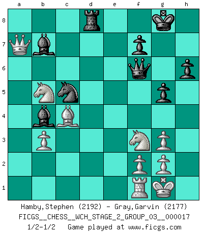Last move : 1/2-1/2 2017 October 16 11:10:21 [Event "FICGS__CHESS__WCH_STAGE_2_GROUP_03__000017"] [Site "FICGS"] [Date "2017.07.19"] [Round "1"] [White "Hamby,Stephen"] [Black "Gray,Garvin"] [Result "1/2-1/2"] [WhiteElo "2192"] [BlackElo "2177"] 1.d4 Nf6 2.c4 e6 3.Nc3 d5 4.Nf3 c6 5.Bg5 h6 6.Bh4 dxc4 7.e4 g5 8.Bg3 b5 9.Be2 Bb4 10.Qc2 Nbd7 11.O-O Bb7 12.Rad1 Nh5 13.d5 Nxg3 14.hxg3 Qe7 15.b3 cxd5 16.exd5 O-O 17.dxe6 Qxe6 18.Nxb5 cxb3 19.axb3 Rac8 20.Qa2 Rfd8 21.Bc4 Qf6 22.Qxa7 Nc5 23.Rxd8+ Rxd8 1/2-1/2 Queen's pawn game Kingside Castling by player White (move 11) Kingside Castling by player Black (move 16) This chess game ended in a draw. Follow this game move after move (download)I'm not a materialistic person, in that, I don't suffer the lack or loss of money. The absence of worldly goods I don't look back on. For Chess is a way I can be as materialistic as I want without having to sell my soul. (Jamie Walter Adams) Wie ich sie so einen nach dem anderen nieder mähte wurde meine Überlegenheit offensichtlich. (José Raúl Capablanca) Cuando le juegas a Fischer, no es una cuestion de si vas a ganar o perder. Es una cuestion de si vas a sobrevivir. (Boris Spassky) Aux échecs, les retours au sommet sont rares : les dommages psychologiques consécutifs à une défaite sont trop sévères. (Daily Telegraph) The leaves of memory seemed to make a mournful rustling in the dark. (Henry Wadsworth Longfellow)