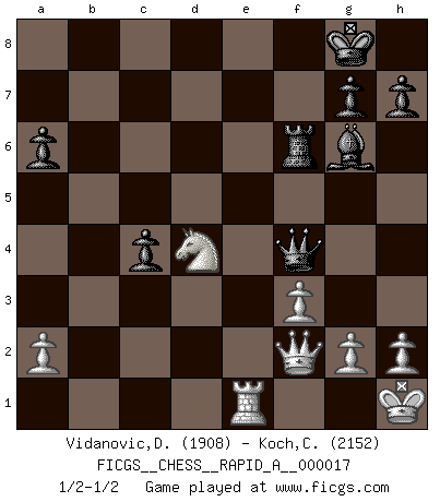 Last move : 1/2-1/2 2007 May 18 23:23:2 [Event "FICGS__CHESS__RAPID_A__000017"] [Site "FICGS"] [Date "2007.04.11"] [Round "1"] [White "Vidanovic,Djordje"] [Black "Koch,Christian"] [Result "1/2-1/2"] [WhiteElo "1908"] [BlackElo "2152"] 1.e4 e5 2.Nf3 Nc6 3.Bb5 Nf6 4.O-O Nxe4 5.d4 Nd6 6.Bxc6 dxc6 7.dxe5 Nf5 8.Qe2 Nd4 9.Nxd4 Qxd4 10.Rd1 Qg4 11.f3 Qf5 12.b3 Bc5+ 13.Kh1 O-O 14.Bb2 Qg6 15.Rd2 Bf5 16.Ba3 Bxa3 17.Nxa3 Rae8 18.Qe3 b5 19.Qc5 Qg5 20.Re2 Re6 21.Rae1 Qf4 22.Qf2 f6 23.c4 a6 24.cxb5 cxb5 25.exf6 Rxe2 26.Qxe2 Rxf6 27.Nc2 c5 28.Qf2 c4 29.bxc4 bxc4 30.Nd4 Bg6 1/2-1/2 Ruy Lopez : Berlin defense, Open variation Kingside Castling by player White (move 4) Kingside Castling by player Black (move 13) This chess game ended in a draw. Follow this game move after move (download)A bad plan is better than none at all. (Frank Marshall) Oft bringt ein stiller Zug das Erdbeben. (Richard Reti) Todo se encuentra en un estado de flujo y esto incluye al mundo del Ajedrez. (Mikhail Botvinnik) Un journaliste : 'Vous préférez avoir une dame de plus sur l'échiquier ou au lit ?' Boris Spassky : 'Ca dépend de la position.' Panic is a sudden desertion of us, an a going over to the enemy of our imagination. (Christian Nevell Bovee)