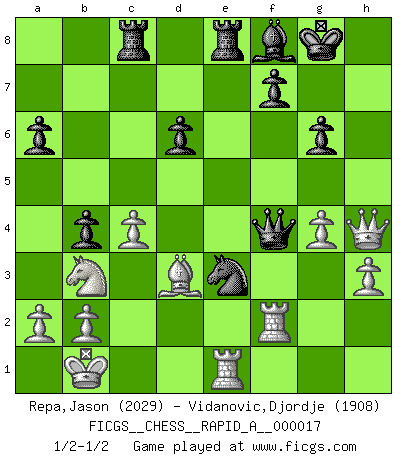 Last move : 1/2-1/2 2007 June 30 17:25:31 [Event "FICGS__CHESS__RAPID_A__000017"] [Site "FICGS"] [Date "2007.04.11"] [Round "1"] [White "Repa,Jason"] [Black "Vidanovic,Djordje"] [Result "1/2-1/2"] [WhiteElo "2029"] [BlackElo "1908"] 1.e4 c5 2.Nf3 d6 3.d4 cxd4 4.Nxd4 Nf6 5.Nc3 a6 6.Be3 e5 7.Nb3 Be6 8.f3 Be7 9.Qd2 h5 10.O-O-O Nbd7 11.Kb1 b5 12.f4 Qc7 13.Nd5 Bxd5 14.exd5 O-O 15.fxe5 Nxe5 16.Bd4 Rfd8 17.Be2 Rac8 18.c3 g6 19.h3 Qb7 20.g4 h4 21.Rhe1 Nxd5 22.Qh6 b4 23.c4 Bf8 24.Qxh4 Ne3 25.Bxe5 Qe4+ 26.Bd3 Qxe5 27.Rd2 Re8 28.Rde2 Qf4 29.Rf2 Qe5 30.Rfe2 Qf4 31.Rf2 1/2-1/2 Sicilian : Najdorf, Byrne (English) attack Queenside Castling by player White (move 10) Kingside Castling by player Black (move 14) This chess game ended in a draw. Follow this game move after move (download)There are tough players and nice guys, and I'm a tough player. (Bobby Fischer) Kein Schachspieler kann gut schlafen. (H. G. Wells) El Ajedrez es en su esencia, un juego. En su forma, un arte. Y en su ejecución, una ciencia. (Baron Tassilo) Les échecs, c'est la lutte contre l'erreur. (Johannes Zukertort) Games, world of games... There's always an opponent, and there's always a victim. (Revolver, movie)