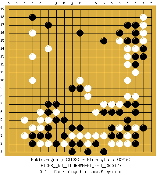 Last move : 0-1 2017 August 4 18:36:45 [Event "FICGS__GO__TOURNAMENT_KYU__000177"] [Site "FICGS"] [Date "2017.07.20"] [Round "1"] [Black "Bakin,Eugeniy"] [White "Flores,Luis"] [Result "0-1"] [Rating 1 "0102"] [Rating 2 "0916"] 1.q4 d4 2.q17 d16 3.r15 d10 4.k16 k10 5.k4 q10 6.q7 r8 7.r7 q8 8.r12 q12 9.r13 r11 10.f4 f2 11.e3 e4 12.f3 e2 13.d3 c3 14.d2 c5 15.h3 f5 16.g5 p7 17.p6 g6 18.h5 q13 19.n15 q3 20.p3 r14 21.s14 q14 22.q15 s15 23.s13 s16 24.r16 s17 25.r17 s18 26.f17 f14 27.k9 l9 28.j9 l8 29.f6 e5 30.g7 p15 31.p16 p2 32.o3 o2 33.r3 o7 34.o6 n7 35.n6 e6 36.f7 q6 37.r6 d13 38.d18 q2 39.r2 r4 40.s4 p4 41.q5 n3 42.o4 l3 43.m2 m3 44.k2 l2 45.l1 m1 46.n1 k3 47.j2 j3 48.j4 h2 49.g2 k1 50.j1 m6 0-1 Here are the names of the openings (joseki) played in the four corners : Corner d4 : d4 f4 Hoshi (Hwajeom, Seongjeom, Xingwei`) 4-4 Point. The star or hoshi (4-4) point, emphasizing influence at the potential expense of territory. Ikken Takagakari (Hankan Nop'dakeolch'im, Yi Gaojia, 1-Space High Approach). White typically responds at 6-4 or 3-10. White 4-10 is played when White finds play on the right side advantageous. White 4-8 or 3-8 may be played when White has support at top. Corner d16 : d16 f17 Hoshi (Hwajeom, Seongjeom, Xingwei`) 4-4 Point. The star or hoshi (4-4) point, emphasizing influence at the potential expense of territory. Ikken Kakari (Hankan Keolch'im, Yi Gua`jiao~, 1-Space Low Approach). Black 2 is the standard approach move to the 4-4. Player White won this Go (weiqi, baduk) game. Follow this game move after move (download)Five liberties for tactical stability. (Anonymous) You think that education is too expensive ? Try ignorance. (Derek Bok)