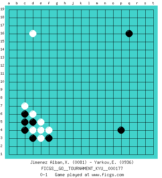 Last move : 0-1 2017 September 4 6:47:34 [Event "FICGS__GO__TOURNAMENT_KYU__000177"] [Site "FICGS"] [Date "2017.07.20"] [Round "1"] [Black "Jimenez Alban,Xavier Miguel"] [White "Yarkov,Evgeny"] [Result "0-1"] [Rating 1 "0081"] [Rating 2 "0936"] 1.q16 d4 2.p4 d16 3.f3 f4 4.c6 d6 5.c5 c7 6.d5 e5 7.c4 e4 8.d3 e3 0-1 This go game has been lost on time (started : 2017.07.20 10:8:5) Here are the names of the openings (joseki) played in the four corners : Corner d4 : d4 f3 Hoshi (Hwajeom, Seongjeom, Xingwei`) 4-4 Point. The star or hoshi (4-4) point, emphasizing influence at the potential expense of territory. Ikken Kakari (Hankan Keolch'im, Yi Gua`jiao~, 1-Space Low Approach). Black 2 is the standard approach move to the 4-4. Player White won this Go (weiqi, baduk) game. Follow this game move after move (download)Each step in a ladder is worth 7 points. (Anonymous) Who needs drugs and alcohol if he can play Big Chess at FICGS ? (Heinz-Georg Lehnhoff)