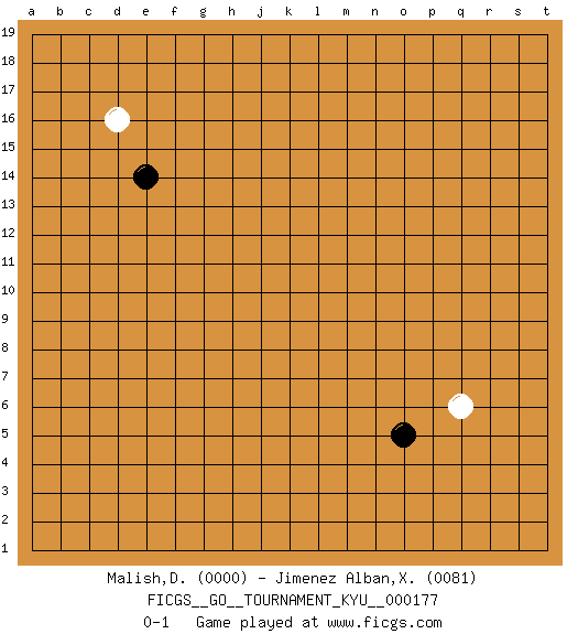 Last move : 0-1 2017 August 26 17:31:39 [Event "FICGS__GO__TOURNAMENT_KYU__000177"] [Site "FICGS"] [Date "2017.07.20"] [Round "1"] [Black "Malish,Dmitriy"] [White "Jimenez Alban,Xavier Miguel"] [Result "0-1"] [Rating 1 "0000"] [Rating 2 "0081"] 1.o5 d16 2.e14 q6 0-1 This go game has been lost on time (started : 2017.07.20 10:8:5) Here are the names of the openings (joseki) played in the four corners : Corner d16 : d16 e14 Hoshi (Hwajeom, Seongjeom, Xingwei`) 4-4 Point. The star or hoshi (4-4) point, emphasizing influence at the potential expense of territory. Corner q4 : o5 q6 This joseki is unknown. A weak or weird move has probably been played in this corner. Player White won this Go (weiqi, baduk) game. Follow this game move after move (download)Stop on second, extend on third. (Anonymous) Treat your password like your toothbrush. Don't let anybody else use it, and get a new one every six months. (Clifford Stoll)