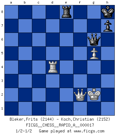 Last move : 1/2-1/2 2007 May 22 18:21:52 [Event "FICGS__CHESS__RAPID_A__000017"] [Site "FICGS"] [Date "2007.04.11"] [Round "1"] [White "Bleker,Frits"] [Black "Koch,Christian"] [Result "1/2-1/2"] [WhiteElo "2144"] [BlackElo "2152"] 1.d4 d5 2.Nf3 Nf6 3.c4 e6 4.Nc3 Be7 5.Bf4 O-O 6.e3 c5 7.dxc5 Bxc5 8.cxd5 Nxd5 9.Nxd5 exd5 10.a3 Nc6 11.Bd3 Bb6 12.O-O d4 13.e4 Bg4 14.h3 Bh5 15.g4 Bg6 16.Nd2 Qe7 17.Nc4 Bc7 18.Bxc7 Qxc7 19.f4 f6 20.Rc1 Rac8 21.h4 Qe7 22.Qf3 Qd7 23.b4 Bf7 24.g5 Kh8 25.b5 Ne7 26.f5 Rc5 27.Qg3 Nc8 28.Nd6 b6 29.Nxf7+ Qxf7 30.Rxc5 bxc5 31.Rc1 Qe7 32.a4 Re8 33.a5 Nd6 34.b6 axb6 35.axb6 c4 36.Bxc4 Nxc4 37.Rxc4 Qxe4 38.Qf2 Qb1+ 39.Kg2 Qxb6 40.Rxd4 fxg5 41.hxg5 g6 42.fxg6 Qxg6 1/2-1/2 Queen's pawn game Kingside Castling by player Black (move 5) Kingside Castling by player White (move 12) 10 pieces endgame at move 41 : White KQRPP , Black KQRPP WHITE : King + 1 Queen 1 Rook 2 Pawns BLACK : King + 1 Queen 1 Rook 2 Pawns 9 pieces endgame at move 42 : White KQRPP , Black KQRP WHITE : King + 1 Queen 1 Rook 2 Pawns BLACK : King + 1 Queen 1 Rook 1 Pawn 8 pieces endgame at move 42 : White KQRP , Black KQRP WHITE : King + 1 Queen 1 Rook 1 Pawn BLACK : King + 1 Queen 1 Rook 1 Pawn This chess game ended in a draw. Follow this game move after move (download)Discovered check is the dive bomber of the Chessboard. (Reuben Fine) Man kann eine Schachpartie nur gewinnen, wenn das Gleichgewicht gestört ist. In einer Stellung mit ungestörtem Gleichgewicht ist auch das größte Genie hilflos - in der Stellung steckt dann eben kein genialer Einfall. (Wilhelm Steinitz) Todavía soy una víctima del Ajedrez. Tiene toda la belleza del arte y mucho mas. No puede ser comercializado. El Ajedrez es mas puro que el arte en su posición social. (Marcel Duchamp) Même un GMI sait rarement calculer sur plus de cinq coups une attaque à sacrifices. (Rudolf Spielmann) No, no, you're not thinking; you're just being logical. (Niels Bohr)