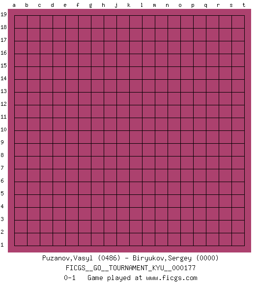 Last move : 0-1 2017 August 19 16:7:21 [Event "FICGS__GO__TOURNAMENT_KYU__000177"] [Site "FICGS"] [Date "2017.07.20"] [Round "1"] [Black "Puzanov,Vasyl"] [White "Biryukov,Sergey"] [Result "0-1"] [Rating 1 "0486"] [Rating 2 "0000"] 0-1 This go game has been lost on time (started : 2017.07.20 10:8:5) Here are the names of the openings (joseki) played in the four corners : Player White won this Go (weiqi, baduk) game. Follow this game move after move (download)Territory is a closed space where time no longer exists. The transformation around it slower alter it, and sometimes it cracks open like a rotten egg at the least shock. (Pierre Audouard) Pretend inferiority and encourage his arrogance. (Sun Tzu)