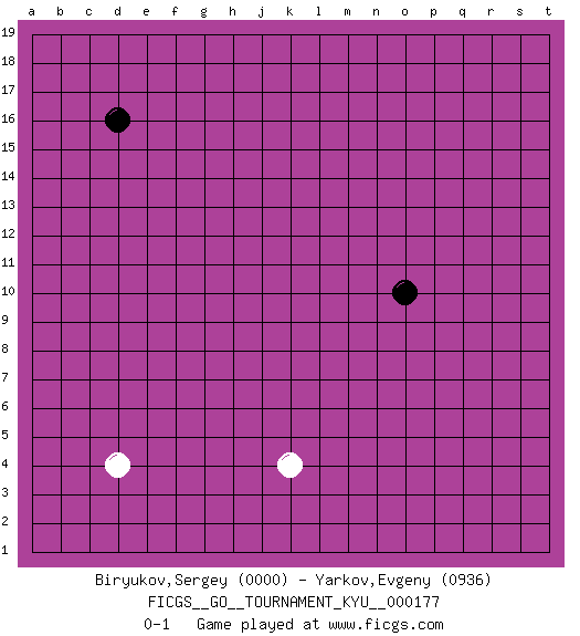 Last move : 0-1 2017 August 21 16:24:19 [Event "FICGS__GO__TOURNAMENT_KYU__000177"] [Site "FICGS"] [Date "2017.07.20"] [Round "1"] [Black "Biryukov,Sergey"] [White "Yarkov,Evgeny"] [Result "0-1"] [Rating 1 "0000"] [Rating 2 "0936"] 1.o10 d4 2.d16 k4 0-1 This go game has been lost on time (started : 2017.07.20 10:8:5) Here are the names of the openings (joseki) played in the four corners : Player White won this Go (weiqi, baduk) game. Follow this game move after move (download)Keshi is worth as much as an invasion ! (Anonymous) The obstacle is the path. (Zen proverb)