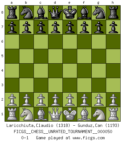 Last move : 0-1 2017 August 29 17:53:42 [Event "FICGS__CHESS__UNRATED_TOURNAMENT__000050"] [Site "FICGS"] [Date "2017.07.20"] [Round "1"] [White "Laricchiuta,Claudio"] [Black "Gunduz,Can"] [Result "0-1"] [WhiteElo "1318"] [BlackElo "1193"] 0-1 This chess game has been lost on time (started : 2017.07.20 10:11:31) Player Black won this chess game. Follow this game move after move (download)The stomach is an essential part of the Chess master. (Bent Larsen) Ein Schachgenie ist jemand der verdammt gut Schach spielt. (Jonathan Levitt) En el Ajedrez, tal como es jugado por los Maestros, practicamente la suerte es eliminada. (Emanuel Lasker) Le plus grand jeu de l'esprit jamais inventé, plus vous l'apprenez, plus vous y prenez du plaisir. (Garry Kasparov) You can only get smarter by playing a smarter opponent. (Revolver, movie)