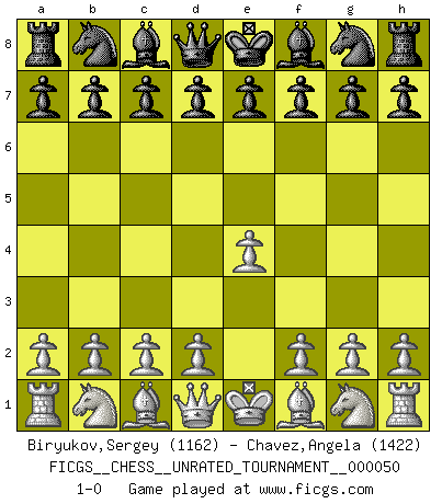 Last move : 1-0 2017 August 30 17:56:53 [Event "FICGS__CHESS__UNRATED_TOURNAMENT__000050"] [Site "FICGS"] [Date "2017.07.20"] [Round "1"] [White "Biryukov,Sergey"] [Black "Chavez,Angela"] [Result "1-0"] [WhiteElo "1162"] [BlackElo "1422"] 1.e4 1-0 This chess game has been lost on time (started : 2017.07.20 10:11:31) King's pawn Opening Player White won this chess game. Follow this game move after move (download)Fischer is the strongest player in the world. In fact, the strongest player who ever lived. (Larry Evans) Alles was am Schachbrett zählt sind gute Züge. (Robert James Fischer) Es muy difícil jugar en contra de la teoría de Einstein. - en su primera derrota en contra de Fischer (Mikhail Tal) C'est la seule position que je connaisse où les deux camps sont mals. Propos prêtés à V. Anand. History is the quarrels of popes and kings, with wars or pestilences in every page; the men all so good for nothing, and hardly any women at all. (Jane Austen)