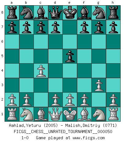 Last move : 1-0 2017 September 2 18:39:59 [Event "FICGS__CHESS__UNRATED_TOURNAMENT__000050"] [Site "FICGS"] [Date "2017.07.20"] [Round "1"] [White "Aahlad,Yeturu"] [Black "Malish,Dmitriy"] [Result "1-0"] [WhiteElo "2005"] [BlackElo "0771"] 1.c4 e5 2.g3 1-0 This chess game has been lost on time (started : 2017.07.20 10:11:31) English Opening Player White won this chess game. Follow this game move after move (download)A player surprised is half beaten. (Proverb) Im Schach gibt es keinen Platz für Galanterie. (Irving Chernev) Nunca nadie ha ganado una partida de Ajedrez rindiendose. (Unknown) La menace est plus forte que l'exécution. (Aaron Nimzovitch) Creativity involves breaking out of established patterns in order to look at things in a different way. (Edward De Bono)