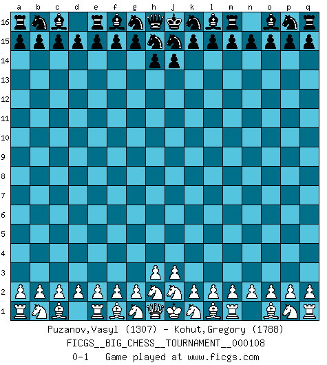 Last move : 0-1 2017 August 19 16:7:21 [Event "FICGS__BIG_CHESS__TOURNAMENT__000108"] [Site "FICGS"] [Date "2017.07.20"] [Round "1"] [White "Puzanov,Vasyl"] [Black "Kohut,Gregory"] [Result "0-1"] [WhiteElo "1307"] [BlackElo "1788"] 0-1 This big chess game has been lost on time (started : 2017.07.20 10:13:9) Follow this game move after move (download)Chess is played with the mind and not with the hands ! (Renaud and Kahn) Ich verstehe Aljechins Kombinationen ganz gut; aber woher er diese Angriffschancen bekommt und wie er die Eröffnung behandelt das ist für mich ein Buch mit sieben Siegeln. (Rudolf Spielmann) El jugador blanco perdió porque fallo en recordar la coreccta continuación y tuvo que pensar por sí mismo las movidas. (Siegbert Tarrasch) Le plus grand jeu de l'esprit jamais inventé, plus vous l'apprenez, plus vous y prenez du plaisir. (Garry Kasparov) If you ain't just a little scared when you enter a casino, you are either very rich or you haven't studied the games enough. (Pappy)