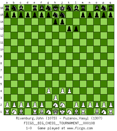 Last move : 1-0 2017 August 28 1:53:37 [Event "FICGS__BIG_CHESS__TOURNAMENT__000108"] [Site "FICGS"] [Date "2017.07.20"] [Round "1"] [White "Rivenburg,John"] [Black "Puzanov,Vasyl"] [Result "1-0"] [WhiteElo "1073"] [BlackElo "1307"] 1.j3-j4 k15-k13 2.g2-g4 l15-l13 3.k2-k4 1-0 Follow this game move after move (download)Good offense and good defense both begin with good development. (Bruce A. Moon) Obendrein hat der FIDE-Präsident den Revolutionsführer Gaddafi zum »Großmeister« ernannt, am Ende der WM. Das ist lächerlich! (Joel Lautier) Es muy difícil jugar en contra de la teoría de Einstein. - en su primera derrota en contra de Fischer (Mikhail Tal) Avant la finale, les dieux ont créé le milieu de partie. (Tarrasch) I feel so... helpless. (C-3PO in Star Wars ep.3)