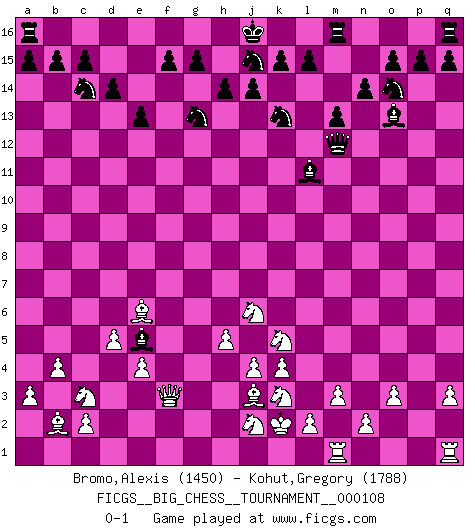 Last move : 0-1 2017 September 12 14:50:13 [Event "FICGS__BIG_CHESS__TOURNAMENT__000108"] [Site "FICGS"] [Date "2017.07.20"] [Round "1"] [White "Bromo,Alexis"] [Black "Kohut,Gregory"] [Result "0-1"] [WhiteElo "1450"] [BlackElo "1788"] 1.k1-l3 j15-k13 2.p1-o3 b16-c14 3.b1-c3 p16-o14 4.g1-f3 e15-e13 5.g2-g4 h15-g13 6.k2-k4 m15-m13 7.h3-h4 f16-c13 8.j3-j4 d15-d14 9.h4-h5 c16-p4 10.q2-q3 p4-o3 11.p2-o3 c13-o2 12.o1-p2 h16-p9 13.l1-j3 p9-p2 14.d2-d3 p2-p8 15.h2-k3 l16-o13 16.e2-e4 n15-n14 17.a2-a3 o16-g9 18.b2-b4 p8-c8 19.c1-b2 o2-h8 20.d3-d4 c8-g4 21.f1-h3 g4-g8 22.m2-m3 g16-j15 23.e1-g1 g8-l12 24.d4-d5 e16-e14 25.f3-h4 e14-f14 26.a1-f1 k16-h15 27.h4-j6 h8-e5 28.j1-k2 g9-k12 29.f2-f4 f14-f4 30.f1-f4 e5-f4 31.l3-k5 f4-e5 32.h3-e6 l12-m12 33.h1-f3 k12-l11 34.g1-g13 h15-g13 0-1 Follow this game move after move (download)Chess is mental torture. (Garry Kasparov) Ein Remis kann durch Wiederholung von drei Zügen oder durch einen schlechte Zug erreicht werden. (Savielly Grigorievitsch Tartakower) Debemos de asegurarnos de que el Ajedrez no se convierta en un lenguaje muerto, muy interesante, pero solo para un grupo muy pequeño. (Sytze Faber) Le temps de noter son nom sur la feuille de partie, j'étais déjà en zeitnot ! D'un modeste amateur apparié lors de la première ronde d'un open contre le grand-maître Azmaïparashvili. I have opinions of my own - strong opinions - but I don't always agree with them. (George Bush)