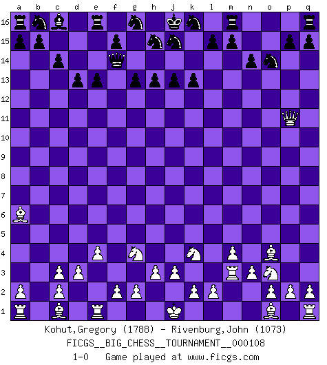 Last move : 1-0 2017 September 26 21:51:52 [Event "FICGS__BIG_CHESS__TOURNAMENT__000108"] [Site "FICGS"] [Date "2017.07.20"] [Round "1"] [White "Kohut,Gregory"] [Black "Rivenburg,John"] [Result "1-0"] [WhiteElo "1788"] [BlackElo "1073"] 1.j2-k4 k15-k13 2.h1-o7 g15-g14 3.o7-o15 p16-o14 4.o15-e6 l16-k15 5.e2-e4 e15-e14 6.b1-c3 g14-g13 7.m2-m4 f16-g15 8.p1-o3 k15-m13 9.e6-j6 g15-c11 10.g1-j2 n15-n14 11.l1-o4 c11-k4 12.j2-k4 e14-e13 13.n2-n3 o16-b4 14.f1-a6 b4-c3 15.b2-c3 h14-h13 16.j6-c12 c15-c14 17.m1-m3 d15-d14 18.h2-g4 h16-f14 19.d2-d3 m13-e6 20.k1-h2 d14-d13 21.c12-b11 e6-g4 22.h2-g4 j14-j13 23.b11-p11 1-0 This big chess game has been lost on time (started : 2017.07.20 10:13:9) Follow this game move after move (download)I believe that Chess possesses a magic that is also a help in advanced age. A rheumatic knee is forgotten during a game of Chess and other events can seem quite unimportant in comparison with a catastrophe on the chessboard. (Vlastimil Hort) Je mehr wir mit Computern analysieren, desto mehr glauben wir an Verteidigung. (Vladimir Kramnik) Jugadores de primera clase pierden en contra de jugadores de segunda clase porque los jugadores de segunda clase a veces juegan una partida de primer clase. (Siegbert Tarrasch) Les Echecs sont et restent toujours un combat, un combat intégral comme la boxe, la lutte ou un autre sport, et où il doit y avoir un vainqueur et un vaincu. (Joseph Emil Diemer) Depression is just anger without enthusiasm. (Unknown)