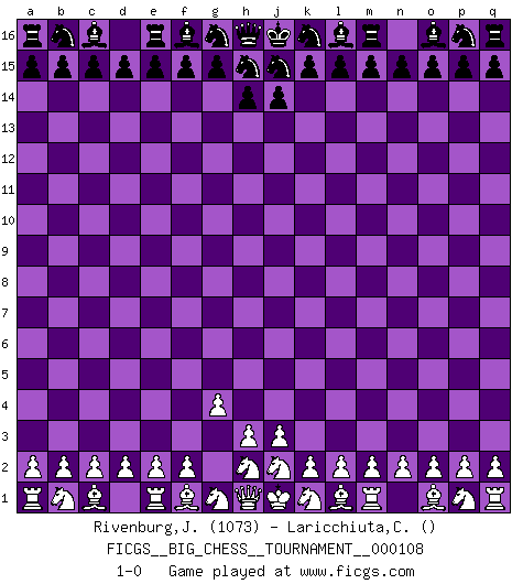 Last move : 1-0 2017 August 20 4:9:0 [Event "FICGS__BIG_CHESS__TOURNAMENT__000108"] [Site "FICGS"] [Date "2017.07.20"] [Round "1"] [White "Rivenburg,John"] [Black "Laricchiuta,Claudio"] [Result "1-0"] [WhiteElo "1073"] [BlackElo ""] 1.g2-g4 1-0 This big chess game has been lost on time (started : 2017.07.20 10:13:9) Follow this game move after move (download)Up to this point White has been following well-known analysis. But now he makes a fatal error: he begins to use his own head. (Siegbert Tarrasch) Bis jetzt ist Weiß einer wohlbekannten Analyse gefolgt. Aber jetzt begeht er einen schrecklichen Fehler: Er beginnt seinen eigenen Kopf zu benutzen. (Siegbert Tarrasch) Los errores estan ahí, esperando a que se cometan. (Savielly Tartakower) Vous savez, camarade Pachman, je n'éprouve pas de plaisir à être ministre, je jouerais plutôt aux échecs comme vous, ou alors ferais une révolution au Venezuela. (Che Guevara à Ludek Pachman, 'Checkmate in Prague', 1975) Good luck. You're gonna need it. (Han Solo in Star Wars ep.6)