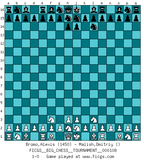 Last move : 1-0 2017 August 28 17:49:35 [Event "FICGS__BIG_CHESS__TOURNAMENT__000108"] [Site "FICGS"] [Date "2017.07.20"] [Round "1"] [White "Bromo,Alexis"] [Black "Malish,Dmitriy"] [Result "1-0"] [WhiteElo "1450"] [BlackElo ""] 1.g1-f3 k16-l14 2.k1-l3 1-0 This big chess game has been lost on time (started : 2017.07.20 10:13:9) Follow this game move after move (download)The older I grow, the more I value Pawns. (Keres) Alle offensichtlichen Züge sehen nach dem Spiel in der Analyse verdächtig aus. (Viktor Kortschnoi) En posiciones complicadas, Bobby Fischer pocas veces tuvo que temer de cualquiera. (Paul Keres) Le joueur d'Echecs qui veut atteindre le top est obligé de développer son propre credo créatif. Alexeï Stepanovicth Souétine. Il est facile d'écrire des livres ! Ce qui est difficile, c'est de jouer ! (Alexeï Stepanovicth Souétine) Programming can only do so much before it becomes too much. (Don Groves)