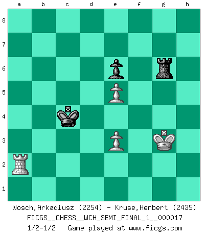 Last move : 1/2-1/2 2017 November 6 7:43:7 [Event "FICGS__CHESS__WCH_SEMI_FINAL_1__000017"] [Site "FICGS"] [Date "2017.07.20"] [Round "4"] [White "Wosch,Arkadiusz"] [Black "Kruse,Herbert"] [Result "1/2-1/2"] [WhiteElo "2254"] [BlackElo "2435"] 1.e4 e5 2.Nf3 Nc6 3.Bb5 Nf6 4.O-O Nxe4 5.d4 Nd6 6.Bxc6 dxc6 7.dxe5 Nf5 8.Qxd8+ Kxd8 9.Nc3 Bd7 10.h3 h6 11.b3 Kc8 12.Bb2 b6 13.Rad1 a5 14.Rd3 Be7 15.a4 Nh4 16.Nxh4 Bxh4 17.Re1 Rd8 18.Rf3 Be6 19.Ne2 Be7 20.Nd4 Bb4 21.Re2 Kb7 22.Nxe6 Rd1+ 23.Kh2 fxe6 24.Rf7 Rad8 25.Rxg7 R8d2 26.Rxd2 Bxd2 27.Rf7 Rb1 28.Bd4 c5 29.Be3 Bxe3 30.fxe3 c4 31.bxc4 Rb4 32.c5 Rxa4 33.cxb6 Rc4 34.bxc7 a4 35.c8Q+ Kxc8 36.Kg3 Rxc2 37.h4 a3 38.Ra7 a2 39.Kf3 h5 40.g4 hxg4+ 41.Kxg4 Kb8 42.Ra3 Kc7 43.h5 Kc6 44.Kg3 Re2 45.Kf3 Rh2 46.h6 Kd5 47.Ra5+ Kc4 48.Kg3 Rxh6 49.Rxa2 Rg6+ 1/2-1/2 Ruy Lopez : Berlin defense, Open variation Kingside Castling by player White (move 4) Promotion Queen by player White (move 35) 10 pieces endgame at move 40 : White KRPPP , Black KRPPP WHITE : King + 1 Rook 3 Pawns BLACK : King + 1 Rook 3 Pawns 9 pieces endgame at move 41 : White KRPPP , Black KRPP WHITE : King + 1 Rook 3 Pawns BLACK : King + 1 Rook 2 Pawns 8 pieces endgame at move 48 : White KRPP , Black KRPP WHITE : King + 1 Rook 2 Pawns BLACK : King + 1 Rook 2 Pawns 7 pieces endgame at move 49 : White KRPP , Black KRP WHITE : King + 1 Rook 2 Pawns BLACK : King + 1 Rook 1 Pawn This chess game ended in a draw. Follow this game move after move (download)Before the endgame, the Gods have placed the middle game. (Siegbert Tarrasch) Um dein Spiel zu verbessern musst du zuallererst das Endspiel studieren, denn diese kann unabhängig studiert werden. Die Eröffnung und das Mittelspiel müssen immer in Bezug gesetzt werden zum Endspiel. (José Raúl Capablanca) Fischer es el jugador mas fuerte del mundo. De hecho, el jugador mas fuerte que jamas haya existido. (Larry Evans) Dieu déplace le joueur, et celui-ci la pièce. Quel Dieu derrière Dieu commence donc la trame ? Arturo Perez-Reverte (prix de littérature policière 1993). No, I am still playing. (Anatoly Karpov)