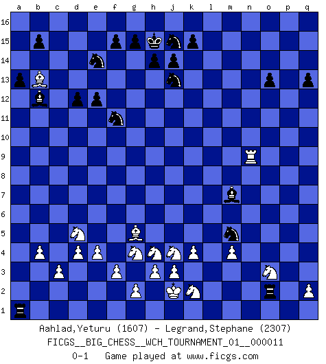 Last move : 0-1 2018 February 26 6:57:33 [Event "FICGS__BIG_CHESS__WCH_TOURNAMENT_01__000011"] [Site "FICGS"] [Date "2017.07.21"] [Round "1"] [White "Aahlad,Yeturu"] [Black "Legrand,Stephane"] [Result "0-1"] [WhiteElo "1607"] [BlackElo "2307"] 1.j2-k4 p16-o14 2.h1-o7 h15-g13 3.o7-c7 j15-k13 4.c7-c15 b16-c14 5.c15-j9 e15-e13 6.m2-m4 h16-o10 7.h2-g4 f16-b12 8.g1-j2 d15-d13 9.l1-p5 m15-m13 10.b1-c3 l16-p12 11.k1-h2 n15-n14 12.e2-e4 k16-h15 13.f1-b5 g16-j15 14.d2-d4 c16-l8 15.j2-h4 o16-h10 16.j9-d9 m16-m14 17.c1-l9 m14-l14 18.c3-d5 c14-d12 19.p1-o3 a16-c16 20.c2-c3 m13-m12 21.n2-n4 m12-m11 22.d9-b9 a15-a13 23.o1-d11 e13-e12 24.d11-h7 o10-n9 25.b9-b10 h10-e13 26.l9-j7 c16-c10 27.b10-d8 n9-n4 28.q1-n1 n4-q7 29.n1-n7 q7-p8 30.m1-n1 g13-f11 31.n7-n8 p8-o9 32.n8-n9 o9-m7 33.n1-n7 m7-p4 34.n7-o7 p4-p2 35.k4-m3 l8-m9 36.o7-o5 m9-l10 37.h7-l10 l14-l10 38.d8-q8 l10-q10 39.q8-p7 p2-q3 40.b5-h11 q3-q7 41.p7-q7 q10-q7 42.p5-l9 h15-j13 43.h11-d15 e16-a16 44.j1-j2 d12-e14 45.d15-a12 c10-b10 46.b2-b4 k13-m12 47.l9-o12 o14-m13 48.e1-p1 q15-q13 49.o12-k8 e13-k8 50.j7-k8 m12-l10 51.k8-g5 b10-e10 52.n9-o9 o15-o14 53.f2-f3 m13-n11 54.o9-d9 d13-d12 55.p1-p8 a16-c16 56.d9-c9 j16-h15 57.p8-c8 c16-c9 58.c8-c9 p12-l8 59.o5-o8 l8-n6 60.k2-k3 q7-a7 61.c9-c10 e10-e9 62.a12-b13 e9-a9 63.a1-p1 a7-a2 64.p1-p15 a2-a1 65.p15-l15 o14-o13 66.l15-m15 q16-l16 67.m15-m11 n11-m9 68.o8-o6 l10-n9 69.m11-m14 l16-l2 70.m3-k2 n6-m7 71.m14-n14 m9-l7 72.c10-n10 l7-m5 73.h2-j4 m5-o6 74.n10-n9 a9-n9 75.n14-n9 o6-m5 76.k3-k4 l2-o2 0-1 Follow this game move after move (download)Avoid the crowd. Do your own thinking independently. Be the Chess player, not the Chess piece. (Ralph Charell) Kein Großmeister ist normal. Sie unterscheiden sich nur im Ausmaß Ihrer Verrücktheit. (Viktor Kortschnoi) No volvere nunca a jugar contigo. Has insultado a mi amigo. - cuando un oponente se maldijo por una mala jugada (Miguel Najdorf) Les écrivains ont utilisé les échecs pour analyser les côtés extrêmes de la nature humaine. Dans ce cadre, les échecs offrent un champ d'expérimentation idéal. Mais on pourrait faire la même chose avec la peinture. Et là, en vous référant à Van Gogh, vous ne tirerez pas de conclusion définitive sur les peintres. (Gary Kasparov) Horse racing is animated roulette. (Roger Kahn)