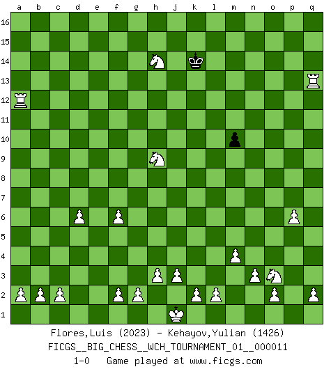 Last move : 1-0 2018 January 3 22:15:28 [Event "FICGS__BIG_CHESS__WCH_TOURNAMENT_01__000011"] [Site "FICGS"] [Date "2017.07.21"] [Round "1"] [White "Flores,Luis"] [Black "Kehayov,Yulian"] [Result "1-0"] [WhiteElo "2023"] [BlackElo "1426"] 1.j2-k4 j15-k13 2.p1-o3 h15-g13 3.e2-e4 n15-n13 4.b1-c3 e15-e13 5.m2-m4 m15-m13 6.f1-b5 g16-j15 7.d2-d3 d15-d13 8.l1-p5 k16-h15 9.n2-n3 f16-c13 10.g1-f3 l16-o13 11.o1-f9 c16-k9 12.c1-l9 o16-g9 13.k1-l3 b16-c14 14.h2-g4 e16-e14 15.h1-p8 p15-p14 16.l9-k10 m16-m14 17.k10-n13 m14-n14 18.n13-q16 p16-n15 19.q16-j9 n15-l14 20.f9-g10 l14-m12 21.g10-d13 e14-d14 22.d13-h9 l15-l14 23.b5-c4 a16-d16 24.p8-q8 q15-q13 25.q8-q12 h15-k16 26.h9-j10 k9-j10 27.c4-j10 d14-d10 28.j10-b3 h16-h15 29.d3-d4 a15-a14 30.a1-d1 c14-b12 31.p5-o4 f15-f14 32.q1-n1 h15-e12 33.q12-h4 k16-m15 34.d4-d5 n14-n10 35.d1-d4 g9-k6 36.h4-h6 k6-j7 37.h6-b6 e12-h12 38.b6-h12 k13-h12 39.j9-m12 l14-l13 40.m12-j9 d10-d9 41.d4-b4 a14-a13 42.k4-h5 j7-d12 43.f3-h4 j16-h15 44.e1-e3 b15-b14 45.e3-f3 n10-f10 46.f3-f10 d12-f10 47.l3-k5 d16-d11 48.m1-m3 f10-h8 49.j9-h8 c13-h8 50.m3-l3 d11-l11 51.l3-l11 h8-l11 52.n1-m1 d9-h9 53.h5-j7 h9-c9 54.m1-m3 h12-f11 55.m3-l3 m13-m12 56.d5-d6 c9-p9 57.o4-p3 p9-d9 58.e4-e5 d9-j9 59.p3-j9 l11-j9 60.c3-e4 o13-e4 61.b4-e4 j9-l11 62.b3-o15 m15-n13 63.o15-e6 l11-k10 64.l3-l13 n13-l14 65.j7-l8 k10-l11 66.k5-l7 g13-j12 67.l13-p13 q13-q12 68.l7-k9 l11-j13 69.p13-p14 q12-q11 70.p14-q14 q11-q10 71.q14-q10 j13-m16 72.p2-p4 c15-c13 73.p4-p5 m16-j13 74.p5-p6 f11-h10 75.k9-h10 j12-h10 76.q10-h10 j13-k12 77.h10-d10 k12-f8 78.d10-d14 c13-c12 79.d14-b14 f8-c11 80.e4-c4 c11-d10 81.c4-c12 d10-e9 82.b14-b13 b12-d11 83.e6-b9 j14-j13 84.b9-d11 h15-j14 85.c12-c15 j15-h13 86.d11-e10 g15-g14 87.b13-b15 j14-k13 88.c15-k15 k13-j12 89.l8-k10 j12-h12 90.h4-g6 h13-k12 91.g4-f6 e9-g7 92.k10-h9 g7-f6 93.e5-f6 h12-h11 94.g6-f8 g14-g13 95.k15-k14 h11-h12 96.k14-h14 h12-j12 97.e10-f9 j12-k11 98.f9-l14 k12-l14 99.h14-l14 a13-a12 100.l14-f14 e13-e12 101.b15-a15 a12-a11 102.f14-f10 g13-g12 103.a15-a11 g12-g11 104.h9-g11 e12-e11 105.g11-f13 j13-j12 106.a11-e11 j12-j11 107.f8-h9 m12-m11 108.e11-j11 k11-l12 109.f10-f12 l12-k13 110.f13-h14 k13-k14 111.f12-k12 k14-l13 112.k12-a12 m11-m10 113.j11-j13 l13-k14 114.j13-q13 1-0 This big chess game has been lost on time (started : 2017.07.21 14:9:35) Follow this game move after move (download)There are tough players and nice guys, and I'm a tough player. (Bobby Fischer) Der beste Spieler in einem Turnier gewinnt es nie. Er landet auf Platz zwei oder drei. (Siegbert Tarrasch) El Ajedrez, como cualquier actividad creativa, solo puede existir a través del esfuerzo combinado de aquellos que tienen talento creativo y de aquellos que poseen la habilidad de organizar su trabajo creativo. (Mikhail Botvinnik) J'ai toujours senti une vague pitié pour l'homme qui ne connaît rien aux échecs, tout comme j'en aurais pour un homme ignorant de l'amour. Les Echecs, comme la musique ou comme l'amour, ont le pouvoir de rendre heureux. (Siegbert Tarrasch) There are lots of people who mistake their imagination for their memory. (Josh Bilings)