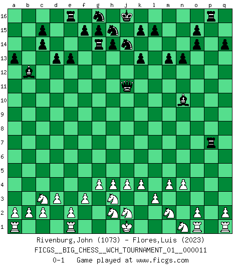 Last move : 0-1 2017 September 25 21:31:26 [Event "FICGS__BIG_CHESS__WCH_TOURNAMENT_01__000011"] [Site "FICGS"] [Date "2017.07.21"] [Round "1"] [White "Rivenburg,John"] [Black "Flores,Luis"] [Result "0-1"] [WhiteElo "1073"] [BlackElo "2023"] 1.g2-g4 p16-o14 2.k2-k4 j15-k13 3.h3-h4 e15-e13 4.j3-j4 b16-c14 5.f1-g2 m15-m13 6.g2-e4 l16-p12 7.d2-d3 f16-b12 8.l2-l3 n15-n13 9.n2-n4 d15-d13 10.c1-p13 q15-q14 11.p13-o14 p15-o14 12.e4-m11 h16-m12 13.m11-k13 j14-k13 14.o1-b13 c16-l8 15.b13-c14 b15-c14 16.m2-m4 a15-a13 17.l1-q6 k16-j14 18.b1-c3 e16-e14 19.p1-o3 e14-g14 20.f2-f3 m12-h12 21.q6-p5 o16-j11 22.p5-j11 h12-j11 23.k1-m2 q16-p16 24.g1-h3 p12-n10 25.h1-g1 p16-p2 26.m1-o1 m16-p16 27.g1-e3 a16-e16 28.e3-e10 l8-j6 29.e10-n10 j6-n10 30.o3-n1 p2-p7 0-1 This big chess game has been lost on time (started : 2017.07.21 14:9:35) Follow this game move after move (download)We cannot resist the fascination of sacrifice, since a passion for sacrifices is part of a Chessplayer's nature. (Rudolf Spielman) Viele Opfer benötigen überhaupt keine konkrete Berechnung. Es genügt sich die entstehende Position kurz vorzustellen, um uns davon zu überzeugen, dass das Opfer korrekt ist. (Mikhail Nekhemyevich Tal) Los finales de Peón son del Ajedrez lo que el cesped es del Golf. (Cecil Purdy) À la honte des hommes, on sait que les lois du jeu sont les seules qui soient partout justes, claires, inviolables et exécutées. Pourquoi l'Indien qui a donné les règles du jeu d'échecs est-il obéi de bon gré dans toute la terre, et que les décrétales des papes, par exemple, sont aujourd'hui un objet d'horreur et de mépris ? C'est que l'inventeur des échecs combina tout avec justesse pour la satisfaction des joueurs, et que les papes, dans leurs décrétales, n'eurent en vue que leur seul avantage. L'Indien voulut exercer également l'esprit des hommes et leur donner du plaisir; les papes ont voulu abrutir l'esprit des hommes. Voltaire (Dictionnaire philosophique / Garnier 1967) All the troubles of the world come from being unable to sit alone in a quiet room. (Blaise Pascal)