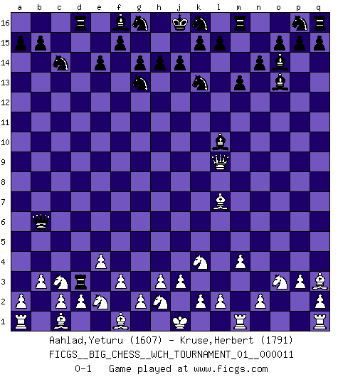 Last move : 0-1 2017 August 19 2:45:23 [Event "FICGS__BIG_CHESS__WCH_TOURNAMENT_01__000011"] [Site "FICGS"] [Date "2017.07.21"] [Round "1"] [White "Aahlad,Yeturu"] [Black "Kruse,Herbert"] [Result "0-1"] [WhiteElo "1607"] [BlackElo "1791"] 1.j2-k4 m15-m13 2.h1-o7 h15-g13 3.o7-c7 j15-k13 4.c7-c15 b16-c14 5.c15-j9 g13-h11 6.j9-f9 h11-g13 7.b2-b3 d15-d13 8.f9-d11 g15-g14 9.d11-d13 h16-m12 10.b1-c3 l16-o13 11.e2-e4 c16-k9 12.f2-f3 m12-o10 13.e1-e3 o10-o2 14.m2-m4 o2-o10 15.k1-l3 e16-d16 16.d13-b13 d16-d15 17.l3-j4 k9-h7 18.b13-b6 n15-n14 19.e3-d3 a16-d16 20.p2-p3 h7-j8 21.p1-o3 o16-k12 22.o1-q3 e15-e14 23.l1-o4 k12-j13 24.b6-p6 j13-l11 25.j4-k6 j8-l10 26.p6-p13 l11-o14 27.p13-l9 o10-k6 28.o4-l7 k6-b6 29.g1-e2 d15-d3 0-1 Follow this game move after move (download)Pawn endings are to Chess what putting is to golf. (Cecil Purdy) Ohne Fehler kann es keine Brillanz geben. (Emanuel Lasker) Debió haber existido una vez en que los hombres eran semidióses, de otra manera no hubiesen podido inventar el Ajedrez. (Gustav Schenk) Des combinaisons [dans le jeu d'échecs] pareilles à des mélodies. Je crois entendre pour ainsi dire la musique des coups... (Vladimir Nabokov) Always be a first-rate version of yourself, instead of a second-rate version of somebody else. (Judy Garland)