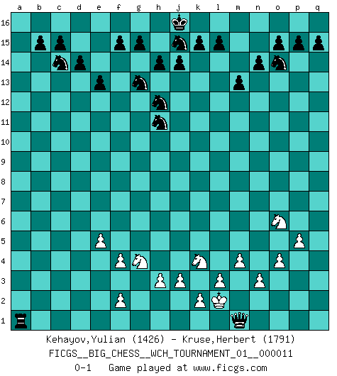Last move : 0-1 2017 August 30 18:31:46 [Event "FICGS__BIG_CHESS__WCH_TOURNAMENT_01__000011"] [Site "FICGS"] [Date "2017.07.21"] [Round "1"] [White "Kehayov,Yulian"] [Black "Kruse,Herbert"] [Result "0-1"] [WhiteElo "1426"] [BlackElo "1791"] 1.j2-k4 m15-m13 2.h2-g4 j15-k13 3.k1-l3 l16-o13 4.g1-f3 o13-c2 5.b1-c3 c2-k9 6.d2-d4 e15-e13 7.e2-e4 f16-c13 8.m2-m4 n15-n14 9.n2-n3 d15-d14 10.h1-l4 h16-o10 11.o2-o4 m16-m14 12.p2-p3 m14-l14 13.l4-k5 k9-m7 14.k5-c12 h15-g13 15.c1-g5 l14-l12 16.c12-c4 c16-j10 17.c4-c6 j10-h11 18.c6-c4 m7-j10 19.c4-c8 l12-l8 20.c8-f5 j10-k9 21.f5-b9 h11-f13 22.b9-d7 k9-h11 23.d7-f5 l8-f8 24.f5-h7 h11-k9 25.h7-b7 o10-g10 26.b7-n7 g10-q1 27.p1-n2 q1-q2 28.n7-o7 p16-o14 29.f1-b5 g16-j15 30.o7-l4 b16-c14 31.l3-m5 f8-l8 32.l4-m3 o16-f8 33.l1-m2 q2-q11 34.o1-p2 f13-d11 35.m3-n4 d11-n2 36.m1-n1 n2-e10 37.p2-o1 e10-o1 38.n1-o1 e16-e14 39.e1-e3 e14-f14 40.f3-e5 a16-e16 41.o1-q1 q11-n8 42.n4-n8 l8-n8 43.j1-j2 k9-h11 44.b5-h11 g13-h11 45.b2-b3 k16-h15 46.e3-f3 c13-b12 47.a2-a4 e16-e14 48.b3-b4 f8-b4 49.a1-b1 f14-f3 50.g2-f3 b4-c3 51.b1-c1 c3-d4 52.f3-f4 d4-b6 53.c1-b1 b6-e9 54.b1-b9 a15-a13 55.q1-q9 e9-d10 56.a4-a5 e14-f14 57.b9-f9 f14-f9 58.q9-f9 h15-g13 59.a5-a6 q16-m16 60.f9-d9 m16-m14 61.d9-d8 n8-d8 62.g5-d8 m14-l14 63.l2-l3 d10-e9 64.d8-e9 b12-e9 65.k4-j6 l14-l12 66.e5-g6 l12-a12 67.e4-e5 a12-a6 68.g6-h4 a13-a12 69.h4-g6 a6-g6 70.j6-k4 a12-a11 71.m2-l1 a11-a10 72.p3-p4 a10-a9 73.l1-m2 a9-a8 74.m2-n1 a8-a7 75.n1-q4 e9-h12 76.q4-h12 k13-h12 77.j2-k3 a7-a6 78.p4-p5 a6-a5 79.k3-j2 a5-a4 80.j2-k3 a4-a3 81.k3-j2 a3-a2 82.j2-k3 a2-a1 83.k3-l2 a1-h1 84.m5-o6 g6-a6 85.o6-m5 a6-a1 86.m5-o6 h1-m1 0-1 Follow this game move after move (download)There are two types of sacrifices: correct ones and mine. (Mikhail Tal) Das Schachspiel übertrifft alle anderen Spiele so weit wie der Chimborasso einen Misthaufen. (Arthur Schopenhauer) No volvere nunca a jugar contigo. Has insultado a mi amigo. - cuando un oponente se maldijo por una mala jugada (Miguel Najdorf) La vie est comme un jeu d'échecs : nous esquissons un plan, mais celui-ci est tributaire de ce que daignent faire l'adversaire aux échecs et le destin dans la vie. (Arthur Schopenhauer) A bird doesn't sing because it has an answer, it sings because it has a song. (Maya Angelou)