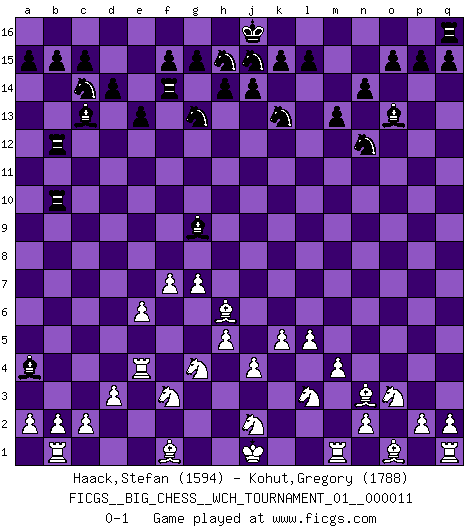Last move : 0-1 2017 October 8 10:31:14 [Event "FICGS__BIG_CHESS__WCH_TOURNAMENT_01__000011"] [Site "FICGS"] [Date "2017.07.21"] [Round "1"] [White "Haack,Stefan"] [Black "Kohut,Gregory"] [Result "0-1"] [WhiteElo "1594"] [BlackElo "1788"] 1.g2-g4 b16-c14 2.k2-k4 j15-k13 3.e2-e3 h16-o10 4.h3-h4 o10-o2 5.p1-o3 o2-g9 6.f2-f4 e15-e13 7.m2-m4 m15-m13 8.l1-n3 l16-o13 9.d2-d3 p16-o14 10.b1-c3 n15-n14 11.g4-g5 f16-c13 12.l2-l4 d15-d14 13.g1-f3 g16-j15 14.e3-e4 c16-k9 15.f4-f5 h15-g13 16.j3-j4 k16-h15 17.k1-l3 e16-e14 18.k4-k5 e14-f14 19.f5-f6 g9-b9 20.h1-g2 o16-g9 21.l4-l5 a16-e16 22.g2-g4 b9-g4 23.h2-g4 e16-e14 24.h4-h5 f14-f10 25.e4-e5 m16-m14 26.g5-g6 e14-f14 27.f6-f7 m14-l14 28.c1-h6 l14-l12 29.e5-e6 o14-n12 30.g6-g7 f10-b10 31.a1-b1 l12-b12 32.c3-a4 k9-h11 33.e1-e4 h11-a4 0-1 This big chess game has been lost on time (started : 2017.07.21 14:9:35) Follow this game move after move (download)The hardest game to win is a won game. (Emanuel Lasker) Warum muß ich gegen diesen IDIOTEN verlieren? (Aaron Nimzowitsch) Yo no creo en la psicología. Yo creo en las buenas movidas. (Bobby Fischer) Vous m'avez demandé de vous exposer quel est le fondement de la prière. Je ne fais que préparer les pièces du jeu sur la table... Nous sera-t-il permis d'en adopter les règles et si nous les appliquons scrupuleusement nous ne tarderons pas à faire mat le Roi divin ! Il ne pourra échapper à nos mains. (Sainte Thérèse d'Avila, Chemin de perfection) Statistics can be made to prove anything - even the truth. (Author unknown)