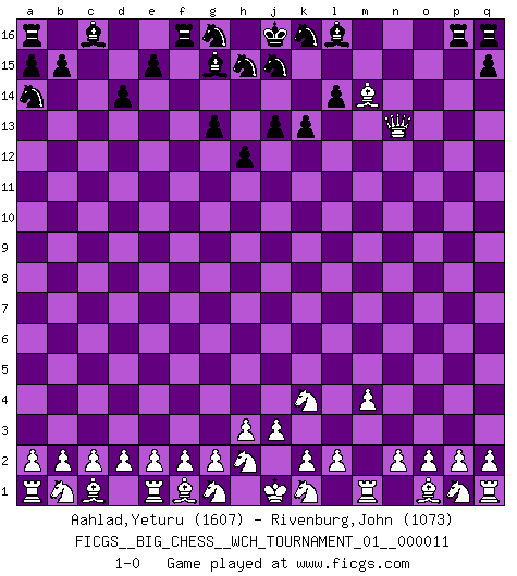 Last move : 1-0 2017 October 4 22:8:41 [Event "FICGS__BIG_CHESS__WCH_TOURNAMENT_01__000011"] [Site "FICGS"] [Date "2017.07.21"] [Round "1"] [White "Aahlad,Yeturu"] [Black "Rivenburg,John"] [Result "1-0"] [WhiteElo "1607"] [BlackElo "1073"] 1.j2-k4 g15-g13 2.h1-o7 h14-h13 3.o7-o15 p16-o14 4.o15-l12 l15-l14 5.l12-c12 k15-k13 6.c12-f15 e16-d16 7.m2-m4 j14-j13 8.l1-o4 h16-g15 9.f15-g15 n15-n13 10.g15-c11 o16-f8 11.c11-f8 f16-g15 12.o4-c15 d16-f16 13.f8-n15 m15-m14 14.n15-p15 m16-p16 15.p15-o14 b16-a14 16.c15-h10 d15-d14 17.h10-m14 h13-h12 18.o14-n13 1-0 This big chess game has been lost on time (started : 2017.07.21 14:9:35) Follow this game move after move (download)Bobby Fischer is the greatest Chess player who has ever lived. (Ken Smith) Unter Putin wird alles Geld aus Russland wie von einem Staubsauger nach Moskau umgeleitet, das ist wie ein schwarzes Loch. (Garry Kasparov) El Peón aislado arroja penumbra sobre todo el tablero. (Aaron Nimzovich) Les Echecs ont trois composantes : le temps, l'espace et le matériel en dernier. (Mikhail Tal) If you work for a living, why do you kill yourself working ? (Tuco to a chicken in The Good, The Bad and The Ugly)