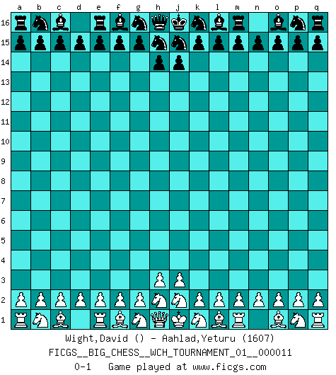 Last move : 0-1 2017 August 20 16:12:29 [Event "FICGS__BIG_CHESS__WCH_TOURNAMENT_01__000011"] [Site "FICGS"] [Date "2017.07.21"] [Round "1"] [White "Wight,David"] [Black "Aahlad,Yeturu"] [Result "0-1"] [WhiteElo ""] [BlackElo "1607"] 0-1 This big chess game has been lost on time (started : 2017.07.21 14:9:35) Follow this game move after move (download)When you play Bobby, it is not a question if you win or lose. It is a question if you survive. (Boris Spassky) Weshalb minderdergeübte Spieler mit g2-g4 beginnen? Die betreffenden sind unschlüssig, ob sie nun rechts (h4) oder links (f4) beginnen sollen, und in ihrer Ratlosigkeit entschliessen sie sich nach guter Bürgerart dazu, den goldenen Mittelweg zu wählen. (Aaron Nimzowitsch) Yo he agregado estos principios a la ley: pongan los Caballos en acción antes de que los dos Alfiles sean desarrollados. (Emanuel Lasker) Le système Elo représente seulement une moyenne. Il est simplement un indicateur de votre stabilité. (Anatoli Karpov) The ultimate in disposing one's troops is to be without ascertainable shape. Then the most penetrating spies cannot pry in nor can the wise lay plans against you. (Sun Tzu)