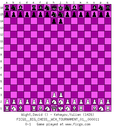 Last move : 0-1 2017 August 20 16:12:29 [Event "FICGS__BIG_CHESS__WCH_TOURNAMENT_01__000011"] [Site "FICGS"] [Date "2017.07.21"] [Round "1"] [White "Wight,David"] [Black "Kehayov,Yulian"] [Result "0-1"] [WhiteElo ""] [BlackElo "1426"] 0-1 This big chess game has been lost on time (started : 2017.07.21 14:9:35) Follow this game move after move (download)In Chess, at least, the brave inherit the earth. (Edmar Mednis) Fischer machte Schach einfach zu einer aufregenden Sache, wann immer er sich ans Brett setzte. (Raymond Keene) Todos los Maestros de Ajedrez fueron un día unos principiantes. (Chernev) Les Echecs ne sont pas pour les âmes timides. Ils requièrent un homme entier, qui ne s'arrête pas aveuglément à ce qui a été déjà établi, mais qui tente individuellement de sonder les profondeurs du jeu. (W. Steinitz) Shallow men believe in luck. Strong men belive in cause and effect. (Ralph Waldo Emerson)