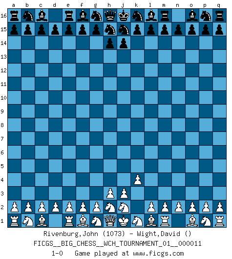 Last move : 1-0 2017 August 21 4:24:5 [Event "FICGS__BIG_CHESS__WCH_TOURNAMENT_01__000011"] [Site "FICGS"] [Date "2017.07.21"] [Round "1"] [White "Rivenburg,John"] [Black "Wight,David"] [Result "1-0"] [WhiteElo "1073"] [BlackElo ""] 1.k2-k4 1-0 This big chess game has been lost on time (started : 2017.07.21 14:9:35) Follow this game move after move (download)The boy (then a 12 year old boy named Anatoly Karpov) doesn't have a clue about Chess, and there's no future at all for him in this profession. (Mikhail Botvinnik) Wir irren allesamt, nur jeder irrt anders. (Georg Christoph Lichtenberg) La captura del Rey enemigo es la finalidad pero no el primer objetivo de la partida. (William Steinitz) Votre prénom est 'Tactique', votre deuxième prénom est 'Tactique' et votre nom est 'Tactique'. (Ken Smith) I take risks, sometimes patients die, but not taking risks causes more patients to die. So I guess my biggest problem is I've been cursed with the ability to do the math. (Gregory House, House M.D.)