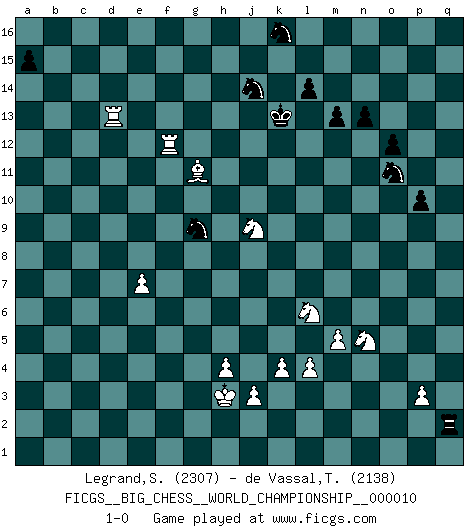 Last move : 1-0 2018 March 26 3:26:31 [Event "FICGS__BIG_CHESS__WORLD_CHAMPIONSHIP__000010"] [Site "FICGS"] [Date "2017.07.21"] [Round "2"] [White "Legrand,Stephane"] [Black "de Vassal,Thibault"] [Result "1-0"] [WhiteElo "2307"] [BlackElo "2138"] 1.m2-m4 j15-k13 2.p1-o3 h16-o10 3.h2-g4 h15-g13 4.b1-c3 e15-e13 5.e2-e4 m15-m13 6.j2-k4 b16-c14 7.f1-b5 l16-p12 8.k1-h2 p16-o14 9.d2-d3 f16-b12 10.l1-p5 k16-h15 11.n2-n3 g16-j15 12.c1-l9 n15-n14 13.h1-p8 d15-d14 14.o1-f9 c16-l8 15.g1-j2 o16-f8 16.e4-e5 q15-q13 17.e5-e6 e16-e14 18.e6-e7 f8-c11 19.a2-a4 e14-f14 20.m4-m5 m16-m14 21.m1-m4 m14-l14 22.k4-l6 f14-f10 23.e1-e6 o10-j10 24.a1-e1 l8-n10 25.p8-p9 l14-l11 26.q1-m1 q16-m16 27.m4-j4 j10-f13 28.l9-j7 f10-l10 29.j2-k4 a16-e16 30.l6-m8 n10-g4 31.h2-g4 l10-j10 32.m8-l6 f13-f12 33.f9-j6 e16-e14 34.j6-p12 f12-p12 35.p9-h9 p12-l12 36.h9-b9 l12-e12 37.b9-k9 j10-e10 38.m1-m4 o14-n12 39.j7-h8 l11-p11 40.b5-k13 j14-k13 41.k9-k13 e12-g10 42.k13-q7 g10-n10 43.q7-o7 n10-o10 44.o7-j7 o10-n11 45.p5-l9 n11-k14 46.l9-o12 g13-j14 47.o12-p11 n12-p11 48.j7-p13 k14-m14 49.h8-n13 p11-n12 50.n13-m14 n12-p13 51.m14-n15 m16-m15 52.n15-p13 m15-m14 53.p13-k8 e10-p10 54.k8-p3 e14-f14 55.e6-f6 f14-f6 56.g4-f6 p15-p13 57.k4-h5 o15-o13 58.m4-p4 p10-p4 59.j4-p4 p13-p12 60.p4-q4 n14-n13 61.q4-q13 m14-o14 62.e1-e4 j15-l14 63.e4-q4 c11-h6 64.f6-g8 h6-l9 65.q4-q9 l9-m10 66.h5-j7 l14-m12 67.q13-q16 h15-k16 68.q16-n16 m12-o11 69.q9-q16 o14-k14 70.n16-m16 l15-l14 71.q16-p16 m10-p13 72.m16-o16 k14-k11 73.p3-j9 o13-o12 74.j7-l8 p13-q12 75.h3-h4 p12-p11 76.o16-o15 k11-k5 77.l2-l4 k5-f5 78.c3-e4 f5-f7 79.j1-h2 f7-k7 80.k2-k4 k7-p7 81.p2-p3 p7-o7 82.l6-n5 o7-o8 83.l8-j7 b12-c13 84.j9-h10 o8-o10 85.h10-m14 p11-p10 86.j7-k9 o10-l10 87.k9-j11 l10-a10 88.e4-f6 q12-p11 89.j11-h13 a10-a4 90.h13-g15 j16-j15 91.g15-h13 j15-h15 92.o15-k15 h15-g14 93.h13-j15 g14-f14 94.p16-p15 a4-a2 95.g8-h10 a2-b2 96.j15-g16 f14-g14 97.k15-f15 b2-c2 98.f15-f14 g14-g13 99.m14-j11 g13-h13 100.f14-h14 h13-j13 101.p15-k15 c2-f2 102.h10-g12 j13-j12 103.f6-g8 p11-l7 104.j11-h10 l7-n9 105.h14-g14 f2-d2 106.g8-j9 d2-d3 107.g12-h14 n9-h14 108.g14-h14 c13-e11 109.h14-h11 e11-b8 110.h2-j2 d3-g3 111.g16-h14 b8-h14 112.h11-h14 g3-g2 113.j2-h3 g2-o2 114.k15-c15 o2-b2 115.n5-l6 b2-n2 116.h14-d14 n2-n3 117.o3-n5 n3-n2 118.c15-b15 c14-d12 119.h10-e13 d12-f11 120.e13-g11 n2-q2 121.b15-b12 j12-k13 122.b12-f12 f11-g9 123.d14-d13 1-0 Follow this game move after move (download)I look one move ahead... the best ! (Siegbert Tarrasch) Im Leben werden Partien nie so unstrittig gewonnen wie im Spiel (Emanuel Lasker) De todos mis libros Rusos, la defensa contiene y difunde el 'calor' mas grande que pudiese verse extraño al observar lo supremamente abstracto que el Ajedrez supuestamente es. (Vladimir Nabokov) Aidez vos pièces, elles vous aideront. (Paul Morphy) However beautiful the strategy, you should occasionally look at the results. (Winston Churchill)