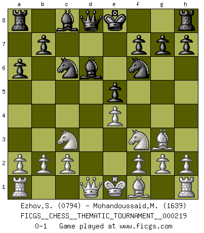 Last move : 0-1 2017 September 10 19:30:4 [Event "FICGS__CHESS__THEMATIC_TOURNAMENT__000219"] [Site "FICGS"] [Date "2017.07.23"] [Round "1"] [White "Ezhov,Sergey"] [Black "Mohandoussaid,Malik"] [Result "0-1"] [WhiteElo "0794"] [BlackElo "1639"] 1.e4 c5 2.Nf3 a6 3.d4 e6 4.Nc3 d6 5.dxc5 Nc6 6.Bf4 e5 7.Bg3 Nf6 8.cxd6 Bxd6 0-1 This chess game has been lost on time (started : 2017.07.23 23:55:13) Sicilian : O'Kelly variation Player Black won this chess game. Follow this game move after move (download)A great player and a great example for many. His book My 60 Memorable Games had a big impact on me. It is a shame he didn't continue to enrich the world of chess with his unparalleled understanding after 1972. (Jan Timman, about Bobby Fischer's death) Es tut gut, die Entwicklungsperiode von, [...] demokratischem Geist durchdringen zu lassen. Wie undemokratisch wäre es doch beispielsweise, den einen Offizier große Spaziertouren vornehmen zu lassen, während die anderen zu Hause säßen und sich entsetzlich langweilten. (Aaron Nimzowitsch) El Ajedrez es un expediente tonto que hace creer a la gente inactiva que hacen una cosa muy astuta cuando solamente estan perdiendo su tiempo. (George Bernard Shaw) Nous sommes les pions de la mystérieuse partie d'Echecs jouée par Dieu. Il nous déplace, nous arrête, nous pousse encore, puis nous lance un à un dans la boîte du Néant. Epitaphe sur la tombe de David Janowsky (1868-1927). Treat your password like your toothbrush. Don't let anybody else use it, and get a new one every six months. (Clifford Stoll)