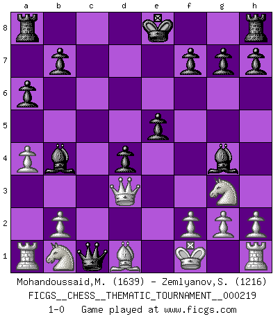 Last move : 1-0 2017 November 23 17:37:17 [Event "FICGS__CHESS__THEMATIC_TOURNAMENT__000219"] [Site "FICGS"] [Date "2017.07.23"] [Round "1"] [White "Mohandoussaid,Malik"] [Black "Zemlyanov,Sergey"] [Result "1-0"] [WhiteElo "1639"] [BlackElo "1216"] 1.e4 c5 2.Nf3 a6 3.a4 Nc6 4.d4 cxd4 5.Nxd4 Nf6 6.Nc3 e5 7.Nf5 Nb4 8.Bc4 d5 9.Bb3 d4 10.Nb1 Nxe4 11.Qf3 Ng5 12.Bxg5 Qxg5 13.Ng3 Nxc2+ 14.Bxc2 Bg4 15.Qd3 Qc1+ 16.Bd1 Bb4+ 17.Kf1 1-0 This chess game has been lost on time (started : 2017.07.23 23:55:13) Sicilian : O'Kelly variation Player White won this chess game. Follow this game move after move (download)On the chessboard, lies and hypocrisy do not survive long. (Emanuel Lasker) Mein Name ist Rustam Kamsky. Sie haben meinen Sohn belästigt. Bereiten Sie sich aufs Sterben vor. (Rustam Kamsky) Yo siempre he tenido un ligero sentimiento de lástima por una persona que no tiene conocimiento del Ajedrez. (Siegbert Tarrasch) En blitz, le Cavalier l'emporte sur le Fou. (Vlastimil Hort) Inventor: A person who makes an ingenious arrangement of wheels, levers and springs, and believes it civilization. (Ambrose Bierce, The Devil's Dictionary)
