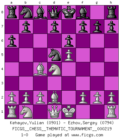 Last move : 1-0 2017 September 13 8:12:43 [Event "FICGS__CHESS__THEMATIC_TOURNAMENT__000219"] [Site "FICGS"] [Date "2017.07.23"] [Round "1"] [White "Kehayov,Yulian"] [Black "Ezhov,Sergey"] [Result "1-0"] [WhiteElo "0901"] [BlackElo "0794"] 1.e4 c5 2.Nf3 a6 3.d4 cxd4 4.Nxd4 Nf6 5.Bc4 e6 6.e5 Nd5 7.Bd2 1-0 This chess game has been lost on time (started : 2017.07.23 23:55:13) Sicilian : O'Kelly variation Player White won this chess game. Follow this game move after move (download)A strong memory, concentration, imagination, and a strong will is required to become a great Chess player. (Bobby Fischer) Vielleicht wirkt die Aura früherer Spieler glanzvoller als die der heutigen Spieler, aber das liegt daran, dass man kein Programm wie Fritz hatte, das einem all die Löcher in ihren Partien zeigt. (Vladimir Kramnik) El Ajedrez es realmente noventa y nueve por ciento calculación. (Soltis) On peut tirer plus d'utilité d'une partie perdue que de 100 parties gagnées. (Capablanca) The question of whether computers can think is just like question of whether submarines can swim. (Edsger W. Dijkstra)