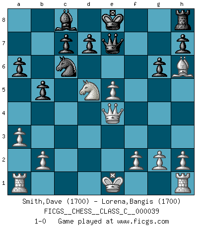 Last move : 1-0 2007 September 2 18:52:54 [Event "FICGS__CHESS__CLASS_C__000039"] [Site "FICGS"] [Date "2007.04.13"] [Round "1"] [White "Smith,Dave"] [Black "Lorena,Bangis"] [Result "1-0"] [WhiteElo "1700"] [BlackElo "1700"] 1.e4 e5 2.Nf3 Nc6 3.Bb5 a6 4.Ba4 b5 5.Bb3 Nd4 6.Nxd4 exd4 7.Bxf7+ Kxf7 8.Qh5+ g6 9.Qd5+ Kf6 10.Qxd4+ Kf7 11.Qd5+ Ke8 12.Qxa8 Bd6 13.d4 Ne7 14.e5 Bb4+ 15.c3 Nc6 16.cxb4 Nxd4 17.Qe4 Nc6 18.Bh6 Qe7 19.Nc3 Nxb4 20.a3 Nc6 21.Nd5 1-0 This chess game has been lost on time (started : 2007.04.13 17:13:25) Ruy Lopez : Caro variation Player White won this chess game. Follow this game move after move (download)Weak points or holes in the opponent's position must be occupied by pieces not Pawns. (Siegbert Tarrasch) Fallen sollten polizeilich verboten werden. (Savielly Grigorievitsch Tartakower) El Ajedrez, como cualquier otra actividad creativa, puede existir solo a través de méritos combinados de aquellos que tienen talento creativo y de aquellos que tienen la habilidad de organizar un trabajo creativo. (Mikhail Botvinnik) La conception d'un plan est le processus par lequel un joueur exploite les avantages de sa position tout en s'efforçant d'en réduire au minimum les inconvénients. Afin de garantir le succès, un plan doit toujours se fonder sur un diagnostic objectif des particularités d'une position. La conception d'un plan est d'autant plus difficile que la position est équilibrée, et grandement facilitée lorsqu'il n'existe qu'un seul plan susceptible de répondre aux exigences de la position. (Harry Golombek) Imagination is more important than knowledge. Knowledge is limited. Imagination encircles the world. (Albert Einstein)