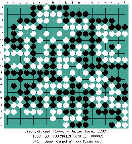 Last move : 0-1 2017 December 16 22:11:4 [Event "FICGS__GO__TOURNAMENT_KYU_II__000063"] [Site "FICGS"] [Date "2017.07.24"] [Round "1"] [Black "Simon,Mickael"] [White "Walzer,Karel"] [Result "0-1"] [Rating 1 "1444"] [Rating 2 "1389"] 1.r16 c4 2.q3 d16 3.p17 e3 4.r10 q16 5.q17 p16 6.o16 q14 7.p14 r15 8.r17 p13 9.o14 r12 10.d10 c12 11.c6 d8 12.c8 c10 13.c9 b10 14.d7 e8 15.e7 q5 16.q7 r4 17.r3 p5 18.o4 o5 19.n4 k4 20.n5 o7 21.n6 p7 22.p10 n7 23.k6 k16 24.n10 q8 25.r8 r7 26.f8 g4 27.f16 g17 28.c14 d13 29.c17 c16 30.d17 e16 31.e17 f17 32.b16 e15 33.e14 g15 34.b15 d14 35.e12 f14 36.e13 c15 37.c13 d12 38.e11 k10 39.o13 p12 40.o12 s15 41.s16 s11 42.s10 n17 43.o17 n16 44.n15 t11 45.t10 t15 46.t16 m3 47.n18 m16 48.m15 l15 49.l14 k14 50.l13 j12 51.l18 j18 52.k13 j13 53.r13 s13 54.q15 p15 55.o15 q15 56.p11 q12 57.b9 f10 58.f9 e10 59.g10 d11 60.d9 f11 61.e9 g11 62.s7 r6 63.q9 p8 64.s5 s6 65.s8 s4 66.t6 m8 67.h10 l11 68.l5 k8 69.n2 m2 70.h11 g12 71.h12 g13 72.s3 t4 73.m17 l16 74.b5 b4 75.b13 b12 76.n3 h6 77.j5 j4 78.h5 g5 79.h4 h3 80.m1 l2 81.l1 k1 82.n1 k2 83.a4 a3 84.a5 b3 85.e18 a13 86.b14 f18 87.t5 k5 88.j6 g7 89.h8 m10 90.l4 k7 91.l7 j7 92.l6 h7 93.k18 j17 94.f19 g19 95.e19 c5 96.b7 j9 97.h9 g8 98.g9 l17 99.m18 p4 100.p3 t3 101.s2 m12 102.k17 j15 103.k3 j3 104.l3 h2 105.e5 e4 106.n11 m13 107.m14 n9 108.m11 l12 109.d5 f6 110.o9 o8 111.l8 l9 112.d4 d3 113.a14 a12 114.f5 e6 115.d6 f7 116.f4 f3 117.h19 g18 118.j19 h18 119.k19 p9 120.o10 t2 121.m7 m4 122.m5 q11 123.q10 j11 124.h13 h14 125.o6 p6 126.a10 a11 127.a9 s1 128.r1 t1 129.k12 k11 130.q4 r5 131.t7 n13 132.n12 j10 133.j8 r11 0-1 Here are the names of the openings (joseki) played in the four corners : Corner q4 : q3 q5 Komoku (Somok, Xiao~mu`) 3-4 Point. The komoku (3-4) point is the traditional corner enclosure move.. Ikken Takagakari (Hankan Nop'dakeolch'im, Yi Gaogua`jiao~, 1-Space High Approach). The 5-4 approach move has become more popular in modern times, as modern Go emphasizes speed and influence. Player White won this Go (weiqi, baduk) game. Follow this game move after move (download)Eyes win semiais. (Anonymous) It is not true that people stop pursuing dreams because they grow old, they grow old because they stop pursuing dreams. (Gabriel Garcia Marquez)