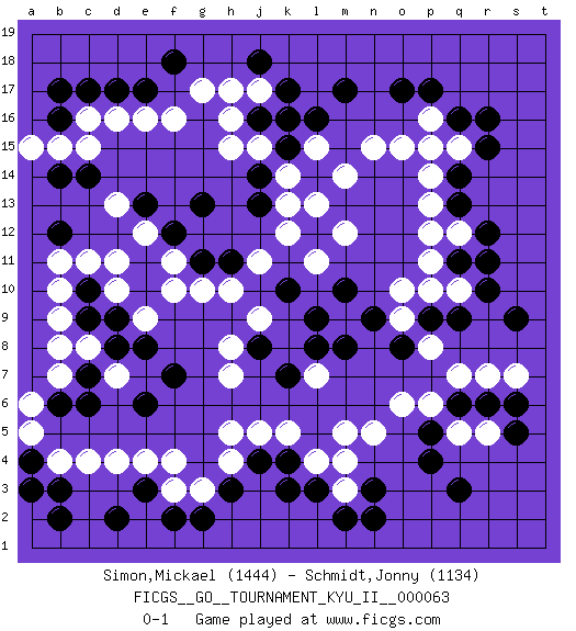 Last move : 0-1 2017 November 29 22:34:54 [Event "FICGS__GO__TOURNAMENT_KYU_II__000063"] [Site "FICGS"] [Date "2017.07.24"] [Round "1"] [Black "Simon,Mickael"] [White "Schmidt,Jonny"] [Result "0-1"] [Rating 1 "1444"] [Rating 2 "1134"] 1.r16 d16 2.q3 d4 3.p17 q5 4.p5 p6 5.p4 o6 6.q6 q7 7.r6 r7 8.s5 r5 9.s6 s7 10.r10 n5 11.c6 c8 12.e6 f4 13.e8 c11 14.n3 j17 15.h3 q10 16.q11 p11 17.r11 p12 18.q13 h5 19.k4 h8 20.c17 c16 21.d17 f16 22.e17 e16 23.b16 b15 24.b17 b4 25.e10 h10 26.c10 b10 27.c9 b9 28.d8 l4 29.l3 k5 30.j4 b7 31.b6 q12 32.r12 d10 33.d9 d11 34.e11 e12 35.f12 f11 36.g13 f10 37.j13 e9 38.e13 g17 39.k10 p13 40.c7 b8 41.q14 k12 42.m10 m12 43.k7 j5 44.f7 h7 45.m8 j11 46.q9 p10 47.p9 o9 48.o8 p8 49.n9 o10 50.s9 m5 51.l9 l7 52.m17 m3 53.m2 m4 54.n2 p14 55.p15 o15 56.l14 p16 57.o17 q15 58.r15 k13 59.f2 h4 60.k3 k14 61.l16 g3 62.g2 m14 63.k15 j15 64.j16 h16 65.k16 l13 66.j14 h15 67.g11 g10 68.h11 l11 69.q16 p15 70.b14 a15 71.c14 c15 72.d2 d7 73.b12 b11 74.b2 f3 75.e3 e4 76.k17 l15 77.j18 h17 78.b3 c4 79.a4 a5 80.a3 a6 81.l8 n15 82.j8 j9 83.f18 d13 0-1 Here are the names of the openings (joseki) played in the four corners : Corner q4 : q3 q5 Komoku (Somok, Xiao~mu`) 3-4 Point. The komoku (3-4) point is the traditional corner enclosure move.. Ikken Takagakari (Hankan Nop'dakeolch'im, Yi Gaogua`jiao~, 1-Space High Approach). The 5-4 approach move has become more popular in modern times, as modern Go emphasizes speed and influence. Corner d4 : d4 c6 Hoshi (Hwajeom, Seongjeom, Xingwei`) 4-4 Point. The star or hoshi (4-4) point, emphasizing influence at the potential expense of territory. Ikken Kakari (Hankan Keolch'im, Yi Gua`jiao~, 1-Space Low Approach). Black 2 is the standard approach move to the 4-4. Player White won this Go (weiqi, baduk) game. Follow this game move after move (download)The possibility or impossibility of an event results logically from the rules. (Pierre Audouard) The best weapon against an enemy is another enemy. (Friedrich Nietzsche)