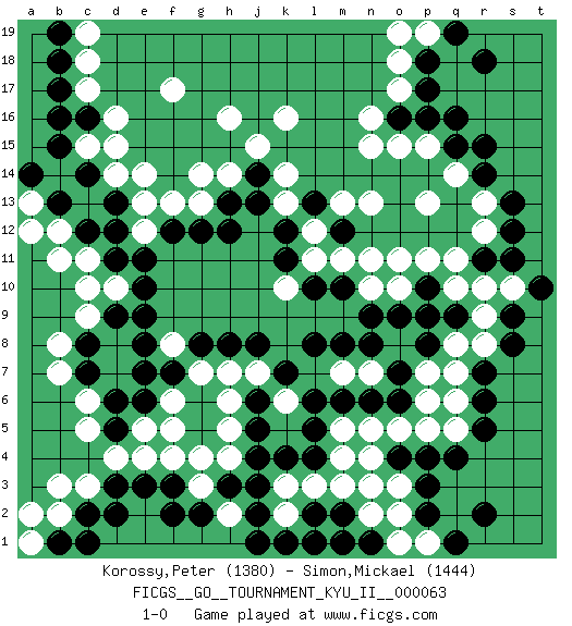 Last move : 1-0 2017 December 12 0:37:26 [Event "FICGS__GO__TOURNAMENT_KYU_II__000063"] [Site "FICGS"] [Date "2017.07.24"] [Round "1"] [Black "Korossy,Peter"] [White "Simon,Mickael"] [Result "1-0"] [Rating 1 "1380"] [Rating 2 "1444"] 1.q16 d4 2.q4 d16 3.c14 f17 4.b16 c17 5.b17 k16 6.d11 o3 7.o4 n4 8.p3 o5 9.p4 n5 10.r6 o17 11.o16 n16 12.p17 o15 13.p16 n15 14.r14 q10 15.r11 r10 16.o9 q11 17.s11 o11 18.f3 c6 19.j3 o2 20.p2 l3 21.k4 m7 22.l10 q7 23.r7 r8 24.k7 c9 25.d2 c3 26.c2 b2 27.b1 b3 28.e9 e14 29.h13 f5 30.l13 n13 31.m12 m13 32.f12 l12 33.k12 l11 34.k11 m11 35.m10 n11 36.o7 p6 37.s8 r9 38.s9 s10 39.t10 k10 40.l8 k13 41.j13 k14 42.f7 h5 43.j6 g7 44.g8 h7 45.h8 j7 46.j8 f8 47.e8 f6 48.e7 g3 49.g2 h2 50.h3 g4 51.f2 o18 52.p18 p1 53.q1 o1 54.r2 p19 55.q19 o19 56.r18 b11 57.c12 k2 58.j2 b12 59.b13 h16 60.b18 c18 61.b19 c19 62.m8 k6 63.l6 n7 64.n8 r12 65.s12 r13 66.s13 q14 67.r15 p15 68.q15 p13 69.l5 h6 70.j5 d10 71.e10 c11 72.d12 g14 73.m2 m3 74.l2 k3 75.k1 g13 76.g12 e13 77.p8 q8 78.o6 p5 79.n6 e4 80.c7 b7 81.c8 b8 82.d9 c10 83.d6 c5 84.c16 d15 85.d13 h4 86.j4 m5 87.m6 c15 88.b15 q5 89.r5 e12 90.e11 n10 91.p10 p11 92.n9 a13 93.a14 a12 94.j14 j15 95.h12 h14 96.e3 f13 97.e6 d14 98.l4 a2 99.l1 n2 100.m1 o10 101.p9 f4 102.d3 m4 103.c1 p7 104.j1 n3 105.d5 q6 106.n1 e5 107.q9 a1 108.pass 1-0 Here are the names of the openings (joseki) played in the four corners : Corner d16 : d16 c14 Hoshi (Hwajeom, Seongjeom, Xingwei`) 4-4 Point. The star or hoshi (4-4) point, emphasizing influence at the potential expense of territory. Ikken Kakari (Hankan Keolch'im, Yi Gua`jiao~, 1-Space Low Approach). Black 2 is the standard approach move to the 4-4. Corner q4 : q4 o3 Hoshi (Hwajeom, Seongjeom, Xingwei`) 4-4 Point. The star or hoshi (4-4) point, emphasizing influence at the potential expense of territory. Ikken Kakari (Hankan Keolch'im, Yi Gua`jiao~, 1-Space Low Approach). White 2 is the standard approach move to the 4-4. Corner q16 : q16 o17 Hoshi (Hwajeom, Seongjeom, Xingwei`) 4-4 Point. The star or hoshi (4-4) point, emphasizing influence at the potential expense of territory. Ikken Kakari (Hankan Keolch'im, Yi Gua`jiao~, 1-Space Low Approach). White 2 is the standard approach move to the 4-4. Corner d4 : d4 f3 Hoshi (Hwajeom, Seongjeom, Xingwei`) 4-4 Point. The star or hoshi (4-4) point, emphasizing influence at the potential expense of territory. Ikken Kakari (Hankan Keolch'im, Yi Gua`jiao~, 1-Space Low Approach). Black 2 is the standard approach move to the 4-4. Player Black won this Go (weiqi, baduk) game. Follow this game move after move (download)In the corner, five stones in a row on the third line are alive. (Anonymous) Some people are so afraid to die that they never begin to live. (Henry Van Dyke)