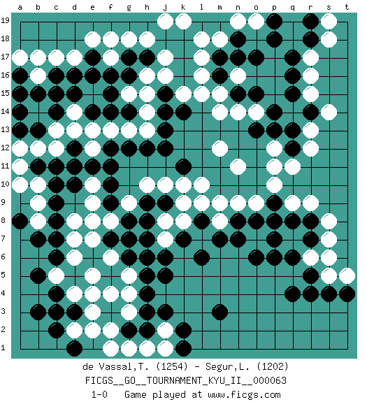 Last move : 1-0 2018 January 30 0:21:9 [Event "FICGS__GO__TOURNAMENT_KYU_II__000063"] [Site "FICGS"] [Date "2017.07.24"] [Round "1"] [Black "de Vassal,Thibault"] [White "Segur,Laurine"] [Result "1-0"] [Rating 1 "1254"] [Rating 2 "1202"] 1.r4 r15 2.q17 r17 3.q16 r16 4.q15 d17 5.c4 e3 6.h3 c3 7.b3 d4 8.c2 d2 9.d3 f2 10.c3 f4 11.m3 r12 12.k17 q9 13.c15 b16 14.c16 c17 15.b15 a17 16.c11 n16 17.o15 l16 18.k16 m14 19.o13 m12 20.o17 m18 21.n15 m15 22.n17 n11 23.m17 l17 24.k18 l18 25.m16 k15 26.j15 r6 27.q4 q18 28.p18 q19 29.k14 l15 30.j13 p11 31.h5 f6 32.d5 e4 33.e16 f18 34.e17 e18 35.g17 f8 36.f11 d8 37.c7 d6 38.c6 e5 39.p6 q7 40.n7 n9 41.l8 l10 42.h8 h6 43.j5 g9 44.h7 g5 45.j6 b9 46.c8 b8 47.c9 b10 48.c10 b12 49.b11 a11 50.d16 b14 51.a15 c12 52.d12 d13 53.c14 c13 54.a13 e12 55.e11 f13 56.f12 d11 57.d10 a12 58.a14 g13 59.g12 g15 60.f15 f17 61.g16 h15 62.f16 h13 63.j12 h16 64.h17 j16 65.j14 j17 66.j18 g18 67.e14 e13 68.f14 h18 69.b13 h10 70.b7 d14 71.d15 d7 72.a8 a10 73.g14 h14 74.h12 j19 75.d12 k19 76.q13 j1 77.h2 h1 78.g2 g1 79.k2 j2 80.j3 e10 81.f10 e9 82.d11 c5 83.b5 m8 84.m7 o7 85.o6 s5 86.s4 r13 87.p7 p8 88.o8 o9 89.n8 m9 90.r5 t5 91.q6 s7 92.q12 q11 93.k1 f1 94.n18 k8 95.k7 j8 96.j9 k9 97.h9 j10 98.a16 l9 99.d1 e2 100.g6 g7 101.h6 l7 102.l6 j7 103.l8 p12 104.g8 g3 105.f7 e7 106.h4 g4 107.p13 n14 108.t4 b17 109.f9 e8 110.g7 o14 111.p14 o19 112.p19 n19 113.r18 s18 114.r19 s19 115.k11 k10 116.r8 s8 117.r7 s6 118.q8 r9 119.p9 p10 120.p8 l7 121.r14 s14 122.l8 1-0 Here are the names of the openings (joseki) played in the four corners : Corner q16 : r15 q17 Mokuhazushi (Waemok, Wai`mu`) 5-3 Point. The mokuhazushi (5-3) point was popular in the Edo period in Japan (1600 - 1867). It emphasizes influence; territorially, it is inferior to the 3-4 point. Komoku Kakari. Black 2 is the standard approach because of its solidity and stability. Corner d4 : c4 e3 Komoku (Somok, Xiao~mu`) 3-4 Point. The komoku (3-4) point is the traditional corner enclosure move.. Ikken Kakari (Hankan Keolch'im, Yi Gua`jiao~, 1-Space Low Pincer). The small knight move is the basic approach move to the 3-4 point stone. It has been continually used for over four centuries. There are limitless variations, with new moves constantly being discovered. White 2 opens the door to a treaure store of joseki. Corner d16 : d17 c15 Komoku (Somok, Xiao~mu`) 3-4 Point. The komoku (3-4) point is the traditional corner enclosure move.. Ikken Kakari (Hankan Keolch'im, Yi Gua`jiao~, 1-Space Low Pincer). The small knight move is the basic approach move to the 3-4 point stone. It has been continually used for over four centuries. There are limitless variations, with new moves constantly being discovered. Black 2 opens the door to a treaure store of joseki. Player Black won this Go (weiqi, baduk) game. Follow this game move after move (download)A basic: Don't push too hard. (Jansteen) A mistake is only a mistake if you let it happen twice. Otherwise it is a learning experience. (Daniel Parmet)