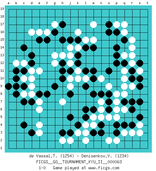 Last move : 1-0 2017 November 6 16:19:15 [Event "FICGS__GO__TOURNAMENT_KYU_II__000063"] [Site "FICGS"] [Date "2017.07.24"] [Round "1"] [Black "de Vassal,Thibault"] [White "Denisenkov,Valentin"] [Result "1-0"] [Rating 1 "1254"] [Rating 2 "1234"] 1.r4 d16 2.c4 q16 3.r11 k3 4.n3 e3 5.d3 e4 6.d7 k16 7.c14 c12 8.d13 e11 9.d12 d11 10.c11 c10 11.b11 b12 12.b10 b9 13.c9 d10 14.b8 c8 15.a9 d9 16.b9 d8 17.c7 e7 18.m6 r3 19.q4 q3 20.p3 p2 21.p4 o2 22.o11 r14 23.o17 p17 24.o16 m17 25.p16 q17 26.p14 q13 27.p13 r9 28.s10 s4 29.s5 s3 30.q15 r15 31.l14 q11 32.q12 r12 33.p12 s11 34.r10 q10 35.s9 q9 36.s12 r13 37.s7 o9 38.l9 p6 39.q7 p7 40.n8 n10 41.m11 q6 42.r6 q8 43.r7 n7 44.m8 n6 45.o8 m5 46.l6 n5 47.n4 l4 48.o7 p5 49.o6 o5 50.l5 m4 51.j5 p8 52.j3 j2 53.k4 l2 54.m3 l3 55.h3 h2 56.f8 e6 57.e8 h7 58.g9 j9 59.h10 j10 60.h11 g12 61.h12 g13 62.e15 e16 63.f15 f16 64.h15 h13 65.j15 j13 66.j11 k11 67.k12 l10 68.l11 k10 69.m10 j12 70.j8 k14 71.k13 j14 72.k15 l15 73.m14 m15 74.g16 g17 75.h17 1-0 Here are the names of the openings (joseki) played in the four corners : Corner q16 : q16 r11 Hoshi (Hwajeom, Seongjeom, Xingwei`) 4-4 Point. The star or hoshi (4-4) point, emphasizing influence at the potential expense of territory. Corner d4 : c4 e3 Komoku (Somok, Xiao~mu`) 3-4 Point. The komoku (3-4) point is the traditional corner enclosure move.. Ikken Kakari (Hankan Keolch'im, Yi Gua`jiao~, 1-Space Low Pincer). The small knight move is the basic approach move to the 3-4 point stone. It has been continually used for over four centuries. There are limitless variations, with new moves constantly being discovered. White 2 opens the door to a treaure store of joseki. Corner d16 : d16 c14 Hoshi (Hwajeom, Seongjeom, Xingwei`) 4-4 Point. The star or hoshi (4-4) point, emphasizing influence at the potential expense of territory. Ikken Kakari (Hankan Keolch'im, Yi Gua`jiao~, 1-Space Low Approach). Black 2 is the standard approach move to the 4-4. Player Black won this Go (weiqi, baduk) game. Follow this game move after move (download)Those who are good at winning, don't usually fight. (Zhang) A clear conscience is usually the sign of a bad memory. (Unknown)