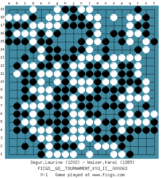 Last move : 0-1 2018 January 31 20:31:36 [Event "FICGS__GO__TOURNAMENT_KYU_II__000063"] [Site "FICGS"] [Date "2017.07.24"] [Round "1"] [Black "Segur,Laurine"] [White "Walzer,Karel"] [Result "0-1"] [Rating 1 "1202"] [Rating 2 "1389"] 1.c4 q17 2.q3 d16 3.c15 d15 4.b17 c18 5.c13 c16 6.b15 h16 7.d10 r11 8.f15 f16 9.c17 d17 10.r6 e4 11.d3 e3 12.e2 f2 13.e1 f1 14.c2 j4 15.m4 q15 16.d14 e14 17.f14 l3 18.m3 m16 19.g3 f3 20.h4 j1 21.h6 k6 22.e6 j3 23.g2 g1 24.h2 h1 25.j2 k2 26.g5 m2 27.k5 k4 28.l4 j5 29.k8 o2 30.o3 n2 31.p3 l1 32.p2 l5 33.m6 d5 34.c6 c5 35.b5 d6 36.e5 d4 37.b4 c7 38.b6 e7 39.f7 j7 40.g8 k10 41.l7 r8 42.n9 m5 43.n5 n4 44.n3 n6 45.o5 m7 46.l6 k5 47.m8 j8 48.k7 k9 49.n7 f6 50.f5 f8 51.g6 f9 52.g9 g10 53.h10 g11 54.j9 j10 55.h9 j6 56.h11 g12 57.h12 k12 58.g13 e10 59.f10 f11 60.e15 e13 61.e12 d7 62.f12 e11 63.d11 d9 64.j13 l13 65.m11 n12 66.s7 q7 67.n11 o12 68.p10 s8 69.q11 r12 70.q12 q13 71.h17 g17 72.j17 j16 73.l17 m17 74.g18 f18 75.k18 k16 76.k17 m18 77.k14 l14 78.h15 j15 79.j14 g15 80.c9 h14 81.g14 h15 82.h13 b16 83.k15 l15 84.e16 e17 85.l16 h18 86.g16 f17 87.p12 p13 88.r10 s10 89.r9 s9 90.d8 e9 91.c8 e8 92.b7 d12 93.f13 c12 94.c11 q9 95.q10 o6 96.p7 q6 97.p6 p5 98.o7 r5 99.r4 s5 100.s4 o11 101.t5 t6 102.t4 s6 103.l12 k13 104.m12 m13 105.k11 j11 106.l11 j12 107.a16 b18 108.a17 a18 109.a15 b11 110.c10 o10 111.p9 q8 112.o9 n10 113.m10 l9 114.m9 p8 115.o8 h7 116.g7 p1 117.q1 o1 118.r17 r16 119.s17 r18 120.s16 s15 121.t15 s14 122.s18 q18 123.r19 p4 124.q4 q5 125.o4 l18 126.h19 g19 127.j19 l19 128.j18 g18 129.d18 d19 130.l8 h3 131.g4 f4 132.h8 k19 133.h5 k3 134.p11 l10 135.n13 o13 136.n14 m15 137.n15 o18 138.o16 pass 139.p16 q16 140.p15 pass 141.r14 r13 142.b12 pass 0-1 Here are the names of the openings (joseki) played in the four corners : Corner d16 : d16 c15 Hoshi (Hwajeom, Seongjeom, Xingwei`) 4-4 Point. The star or hoshi (4-4) point, emphasizing influence at the potential expense of territory. Corner d4 : c4 e4 Komoku (Somok, Xiao~mu`) 3-4 Point. The komoku (3-4) point is the traditional corner enclosure move.. Ikken Takagakari (Hankan Nop'dakeolch'im, Yi Gaogua`jiao~, 1-Space High Approach). The 5-4 approach move has become more popular in modern times, as modern Go emphasizes speed and influence. Player White won this Go (weiqi, baduk) game. Follow this game move after move (download)If you have lost four corners, resign. (Anonymous) When a man with money meets a man with experience, the man with experience leaves with money and the man with money leaves with experience. (Anonymous)