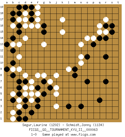 Last move : 1-0 2018 January 24 11:54:42 [Event "FICGS__GO__TOURNAMENT_KYU_II__000063"] [Site "FICGS"] [Date "2017.07.24"] [Round "1"] [Black "Segur,Laurine"] [White "Schmidt,Jonny"] [Result "1-0"] [Rating 1 "1202"] [Rating 2 "1134"] 1.d4 d16 2.q4 q16 3.r7 j3 4.n3 k17 5.r11 j8 6.f3 c11 7.e17 e16 8.c18 d17 9.b17 d18 10.c15 j5 11.c7 c13 12.b14 d14 13.b12 b13 14.a13 n11 15.g16 g13 16.e18 f17 17.d19 f18 18.e19 f16 19.g15 k15 20.r14 n13 21.o7 c9 22.b8 d8 23.r16 r17 24.s16 q15 25.q14 p14 26.p13 o14 27.o11 r15 28.s15 n10 29.f6 f8 30.h6 j6 31.l3 h7 32.g7 g8 33.m8 l9 34.m9 b16 35.c16 c17 36.b18 f19 37.c19 c3 38.d3 c4 39.c2 b2 40.c1 d5 41.c5 b5 42.c6 d2 43.e2 b1 44.d1 e6 45.e5 d6 46.d7 e7 47.b10 b9 48.a9 f5 49.g5 e4 50.f4 e5 51.b4 1-0 This go game has been lost on time (started : 2017.07.24 15:34:58) Here are the names of the openings (joseki) played in the four corners : Corner d4 : d4 j3 Hoshi (Hwajeom, Seongjeom, Xingwei`) 4-4 Point. The star or hoshi (4-4) point, emphasizing influence at the potential expense of territory. Corner q16 : q16 r11 Hoshi (Hwajeom, Seongjeom, Xingwei`) 4-4 Point. The star or hoshi (4-4) point, emphasizing influence at the potential expense of territory. Player Black won this Go (weiqi, baduk) game. Follow this game move after move (download)When you study joseki, you lose two stones in strength. (Anonymous) Men never do evil so completely and cheerfully as when they do it from religious conviction. (Blaise Pascal)