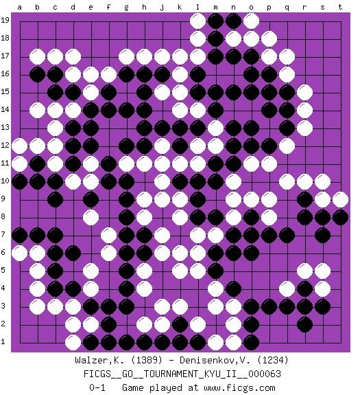 Last move : 0-1 2017 November 8 20:38:17 [Event "FICGS__GO__TOURNAMENT_KYU_II__000063"] [Site "FICGS"] [Date "2017.07.24"] [Round "1"] [Black "Walzer,Karel"] [White "Denisenkov,Valentin"] [Result "0-1"] [Rating 1 "1389"] [Rating 2 "1234"] 1.d4 q16 2.r4 d17 3.p3 q10 4.d15 f16 5.c16 c17 6.d11 j3 7.g3 m3 8.o16 p17 9.o17 k17 10.l16 l17 11.m17 k16 12.l15 k15 13.q15 r15 14.q14 r14 15.q13 r13 16.p16 q17 17.r8 q12 18.p12 p11 19.o12 o11 20.n12 l14 21.m15 c3 22.c4 d3 23.e3 e2 24.f2 e4 25.f3 b4 26.c6 b5 27.b7 b3 28.n4 n3 29.o3 m4 30.m5 l5 31.m6 k5 32.k10 f13 33.d13 d2 34.g5 e5 35.d6 f6 36.h6 f7 37.k7 o7 38.p7 p8 39.q7 m7 40.o8 l6 41.n6 l7 42.n7 n8 43.o6 o9 44.j13 k14 45.g10 k8 46.h7 h8 47.j8 j9 48.g8 j7 49.g7 e8 50.c9 e10 51.f11 d10 52.c10 e11 53.e12 f12 54.g9 o14 55.m14 p13 56.p15 m13 57.n13 m12 58.g12 g13 59.h12 n14 60.n11 n10 61.m11 l11 62.m10 k11 63.l10 j10 64.n15 r3 65.q3 s4 66.s3 r5 67.r2 q4 68.r3 s5 69.s7 b14 70.b16 c11 71.d12 b12 72.b11 c12 73.b10 d14 74.e14 c14 75.e13 e15 76.f15 e16 77.g14 d16 78.g16 g17 79.h16 h17 80.h14 b6 81.c7 h11 82.f10 g11 83.e9 j12 84.h13 s9 85.r9 r10 86.l13 l12 87.k13 n18 88.m18 o18 89.n17 l18 90.n19 o19 91.m19 p18 92.o13 j6 93.j1 j2 94.h1 k1 95.k2 h2 96.g1 l2 97.l1 k3 98.k1 n2 99.o2 m1 100.m8 n9 101.l8 k9 102.p14 c13 103.f14 h4 104.g4 h5 105.g6 a11 106.a10 a12 107.s8 s10 108.o15 h9 109.o7 p9 110.o1 n1 111.j16 j17 112.c5 j15 113.h15 l19 114.k12 j11 115.l9 k6 116.c15 b17 117.a7 a6 118.t8 t9 119.e1 d1 120.f1 pass 0-1 Here are the names of the openings (joseki) played in the four corners : Corner d16 : d17 d15 Komoku (Somok, Xiao~mu`) 3-4 Point. The komoku (3-4) point is the traditional corner enclosure move.. Ikken Takagakari (Hankan Nop'dakeolch'im, Yi Gaogua`jiao~, 1-Space High Approach). The 5-4 approach move has become more popular in modern times, as modern Go emphasizes speed and influence. Corner d4 : d4 j3 Hoshi (Hwajeom, Seongjeom, Xingwei`) 4-4 Point. The star or hoshi (4-4) point, emphasizing influence at the potential expense of territory. Corner q16 : q16 o16 Hoshi (Hwajeom, Seongjeom, Xingwei`) 4-4 Point. The star or hoshi (4-4) point, emphasizing influence at the potential expense of territory. Ikken Takagakari (Hankan Nop'dakeolch'im, Yi Gaojia, 1-Space High Approach). White typically responds at 6-4 or 3-10. White 4-10 is played when White finds play on the right side advantageous. White 4-8 or 3-8 may be played when White has support at top. Player White won this Go (weiqi, baduk) game. Follow this game move after move (download)If you cannot succeed, then die gloriously. (Chinese proverb) The weakness of an artist is dogma. (Josh Waitzkin)