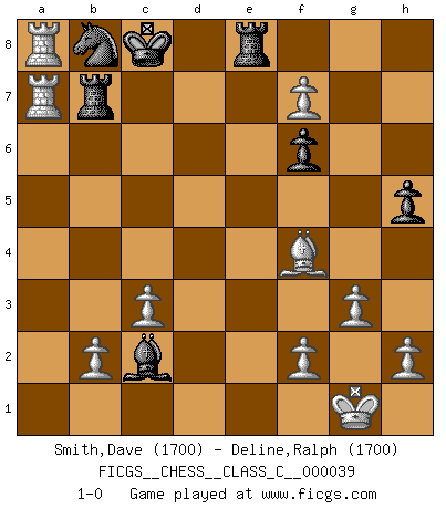 Last move : 1-0 2007 April 24 20:34:21 [Event "FICGS__CHESS__CLASS_C__000039"] [Site "FICGS"] [Date "2007.04.13"] [Round "1"] [White "Smith,Dave"] [Black "Deline,Ralph"] [Result "1-0"] [WhiteElo "1700"] [BlackElo "1700"] 1.e4 c6 2.d4 d5 3.Nc3 dxe4 4.Nxe4 Nf6 5.Nxf6+ gxf6 6.c3 Bf5 7.Nf3 Nd7 8.g3 Qa5 9.Bg2 Qb5 10.Qb3 Qxb3 11.axb3 Bc2 12.O-O Bxb3 13.Bf4 e6 14.Nd2 Bc2 15.Rfe1 Be7 16.Nc4 h5 17.Na5 O-O-O 18.Bxc6 bxc6 19.Nxc6 Rde8 20.Rxa7 e5 21.Nxe7+ Rxe7 22.Ra8+ Nb8 23.dxe5 Kb7 24.Rea1 Rhe8 25.R1a7+ Kc8 26.e6 Rb7 27.exf7 1-0 Caro-Kann : Bronstein-Larsen variation Kingside Castling by player White (move 12) Queenside Castling by player Black (move 17) Player White won this chess game. Follow this game move after move (download)Many have become Chess Masters, no one has become the Master of Chess. (Siegbert Tarrasch) Pläne sind die Träume des Verständigen. (Ernst Freiherr von Feuchtersleben) Yo tuve un dolor de muelas en la primer partida. En el segundo juego, tuve un dolor de cabeza. En el tercero, tuve un ataque de reumatísmo. En la cuarta partida, no me sentía muy bien. ¿Y en el quinto juego? Bueno, ¿que acaso uno tiene que ganar todos los juegos?. (Siegbert Tarrasch) Les échecs c'est le défi de l'alpiniste, toujours plus haut, prêt à tout pour monter à l'assaut du Roi ennemi. Les échecs, c'est de la musique en mouvement, un ballet majestueux pour les yeux. C'est de la poésie composée par les fantômes du passé qui au même titre que Rimbaud ou Verlaine méritent notre admiration. Les échecs, c'est de la peinture ou le moindre mouvement modifie le tableau pour en faire un Picasso ou un Van Gogh. Les échecs, c'est tout et rien, c'est la vie et la mort. Jjulie33 sur le forum de France-Echecs. When you don't know what to do, walk fast and look worried. (Anonymous)