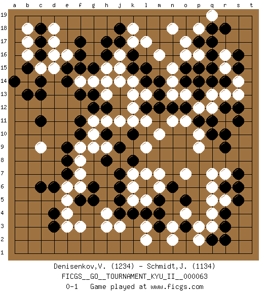 Last move : 0-1 2017 December 18 13:23:18 [Event "FICGS__GO__TOURNAMENT_KYU_II__000063"] [Site "FICGS"] [Date "2017.07.24"] [Round "1"] [Black "Denisenkov,Valentin"] [White "Schmidt,Jonny"] [Result "0-1"] [Rating 1 "1234"] [Rating 2 "1134"] 1.q16 q4 2.d4 d16 3.o3 r11 4.r14 m10 5.r3 q3 6.r4 q5 7.q2 p2 8.r2 p3 9.r6 r5 10.s5 q7 11.s7 j3 12.c14 q6 13.r9 c9 14.c11 p9 15.c6 f6 16.e7 o17 17.p17 l17 18.f17 f14 19.c17 f7 20.e9 d17 21.c16 r7 22.s6 f8 23.e8 d15 24.c13 c15 25.b15 b14 26.b13 b16 27.a14 b17 28.c18 b18 29.j17 f9 30.f10 g10 31.f11 g11 32.k15 j16 33.h16 j15 34.k16 k17 35.j18 n15 36.l14 j14 37.l12 l13 38.m13 k13 39.m14 p18 40.q18 p16 41.q17 n18 42.p13 o13 43.o14 n14 44.o12 n13 45.n12 p14 46.p15 p12 47.q14 o16 48.o15 m16 49.p11 q12 50.q10 o11 51.r10 n11 52.m12 k12 53.r12 r13 54.s12 q13 55.p14 s13 56.s11 s14 57.s15 r15 58.q15 q19 59.r18 r16 60.s16 p10 61.q11 e3 62.d3 f3 63.l6 l5 64.m5 m6 65.m4 l3 66.m3 l2 67.n6 m7 68.l4 k5 69.k4 o4 70.j5 k6 71.j4 h3 72.j6 k7 73.f5 e5 74.g5 e4 75.h8 e6 76.d6 l11 77.j7 n2 78.k8 l7 79.g6 h9 80.j9 l9 81.o5 o7 82.h10 g9 83.k10 k11 84.f13 h4 85.g12 h11 86.e14 g14 87.e15 e16 88.f16 d18 89.f15 k18 90.h17 n3 91.h14 k14 92.l15 h15 93.g15 h13 94.g13 h14 95.h12 j11 0-1 Here are the names of the openings (joseki) played in the four corners : Corner q4 : q4 o3 Hoshi (Hwajeom, Seongjeom, Xingwei`) 4-4 Point. The star or hoshi (4-4) point, emphasizing influence at the potential expense of territory. Ikken Kakari (Hankan Keolch'im, Yi Gua`jiao~, 1-Space Low Approach). Black 2 is the standard approach move to the 4-4. Corner q16 : q16 r11 Hoshi (Hwajeom, Seongjeom, Xingwei`) 4-4 Point. The star or hoshi (4-4) point, emphasizing influence at the potential expense of territory. Corner d4 : d4 j3 Hoshi (Hwajeom, Seongjeom, Xingwei`) 4-4 Point. The star or hoshi (4-4) point, emphasizing influence at the potential expense of territory. Corner d16 : d16 c14 Hoshi (Hwajeom, Seongjeom, Xingwei`) 4-4 Point. The star or hoshi (4-4) point, emphasizing influence at the potential expense of territory. Ikken Kakari (Hankan Keolch'im, Yi Gua`jiao~, 1-Space Low Approach). Black 2 is the standard approach move to the 4-4. Player White won this Go (weiqi, baduk) game. Follow this game move after move (download)If you have lost four corners, resign. (Anonymous) Memory is a complicated thing, a relative to truth, but not its twin. (Barbara Kingsolver, Animal Dreams)