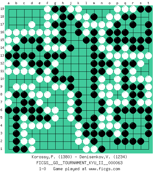 Last move : 1-0 2018 January 1 23:20:49 [Event "FICGS__GO__TOURNAMENT_KYU_II__000063"] [Site "FICGS"] [Date "2017.07.24"] [Round "1"] [Black "Korossy,Peter"] [White "Denisenkov,Valentin"] [Result "1-0"] [Rating 1 "1380"] [Rating 2 "1234"] 1.q16 d4 2.q4 d17 3.c15 c16 4.d15 f16 5.d12 o17 6.o16 n16 7.p17 n17 8.o15 r10 9.r7 r13 10.o3 k4 11.c6 d8 12.e6 f4 13.b4 c3 14.b3 c11 15.f12 c12 16.b8 c9 17.c8 b9 18.k17 l17 19.k16 k18 20.j18 l18 21.h17 g18 22.h15 g16 23.m15 p18 24.q18 o18 25.m18 n15 26.m14 n14 27.m13 o13 28.r15 d11 29.d13 f14 30.h13 g12 31.f13 g14 32.g13 h14 33.j14 g6 34.e9 d9 35.e11 e8 36.f9 f8 37.b2 c2 38.k6 g9 39.j9 j8 40.k8 j7 41.k7 j6 42.g10 f10 43.h10 e10 44.q12 q13 45.r12 p12 46.q11 p10 47.q10 p11 48.q9 s12 49.s14 s13 50.s9 s10 51.r9 t10 52.n11 n10 53.m10 o9 54.m9 o7 55.l3 k3 56.l4 l2 57.m2 k2 58.m3 r3 59.r4 s4 60.q2 s5 61.s2 s7 62.q6 t9 63.s8 s3 64.r2 o5 65.p5 n9 66.n6 o6 67.n7 n8 68.m8 n5 69.m5 f11 70.g11 h9 71.j10 b15 72.b14 b16 73.c13 s17 74.r17 s16 75.s15 s18 76.r18 r16 77.s19 q14 78.q15 p15 79.p14 o14 80.p16 p13 81.p8 o8 82.c1 d1 83.b1 d2 84.c7 t18 85.t16 q19 86.t15 p19 87.t17 r19 88.t19 p3 89.q3 o4 90.n3 p4 91.p2 n12 92.m12 o11 93.m11 t8 94.s6 t7 95.t6 r5 96.r6 q5 97.p6 p7 98.t3 q8 99.r8 q7 100.t4 p9 101.e5 e4 102.f5 g5 103.k5 j5 104.m16 m17 105.g17 f17 106.h18 f18 107.b12 b11 108.h16 a12 109.b13 c5 110.b5 d6 111.d5 c4 112.d7 e7 113.e14 d16 114.e15 e16 115.e12 f6 116.d6 a8 117.b6 a7 118.a6 l16 119.l15 r11 120.t5 n4 121.m4 m1 122.n1 l1 123.n13 j19 124.h19 k19 125.g19 f19 126.p15 t13 127.a13 a11 128.a15 a16 129.o12 a14 130.n12 a15 131.g15 f15 132.r14 1-0 Here are the names of the openings (joseki) played in the four corners : Corner d16 : d17 c15 Komoku (Somok, Xiao~mu`) 3-4 Point. The komoku (3-4) point is the traditional corner enclosure move.. Ikken Kakari (Hankan Keolch'im, Yi Gua`jiao~, 1-Space Low Pincer). The small knight move is the basic approach move to the 3-4 point stone. It has been continually used for over four centuries. There are limitless variations, with new moves constantly being discovered. Black 2 opens the door to a treaure store of joseki. Corner q16 : q16 o17 Hoshi (Hwajeom, Seongjeom, Xingwei`) 4-4 Point. The star or hoshi (4-4) point, emphasizing influence at the potential expense of territory. Ikken Kakari (Hankan Keolch'im, Yi Gua`jiao~, 1-Space Low Approach). White 2 is the standard approach move to the 4-4. Corner d4 : d4 c6 Hoshi (Hwajeom, Seongjeom, Xingwei`) 4-4 Point. The star or hoshi (4-4) point, emphasizing influence at the potential expense of territory. Ikken Kakari (Hankan Keolch'im, Yi Gua`jiao~, 1-Space Low Approach). Black 2 is the standard approach move to the 4-4. Player Black won this Go (weiqi, baduk) game. Follow this game move after move (download)While the Baroque rules of chess could only have been created by humans, the rules of go are so elegant, organic, and rigorously logical that if intelligent life forms exist elsewhere in the universe, they almost certainly play go. (Edward Lasker, international chess master) Panic is a sudden desertion of us, an a going over to the enemy of our imagination. (Christian Nevell Bovee)